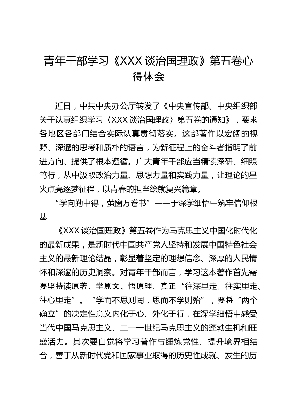 青年干部學(xué)習(xí)《XXX談治國理政》第五卷心得體會近日,中共中央辦公廳轉(zhuǎn)發(fā)了《中央宣傳部、中央組織部關(guān)于認真組織學(xué)習(xí)〈XXX談治國理政〉第五卷的通知》,要求各地區(qū)各部門結(jié)合實際認真貫徹落實。這部著作以宏闊的視野、深邃的思考和質(zhì)樸的語言,為新征程上的奮斗者指明了前進方向、提供了根本遵循。廣大青年干部應(yīng)當精讀深研、細照篤行,從中汲取政治力量、思想力量和實踐力量,讓理論的星火點亮逐夢征程,以青春的擔(dān)當繪就復(fù)興篇章。“學(xué)向勤中得,螢窗萬卷書”——于深學(xué)細悟中筑牢信仰根基《XXX談治國理政》第五卷作為馬克思主義中國化時代化的最新成果,是新時代中國...