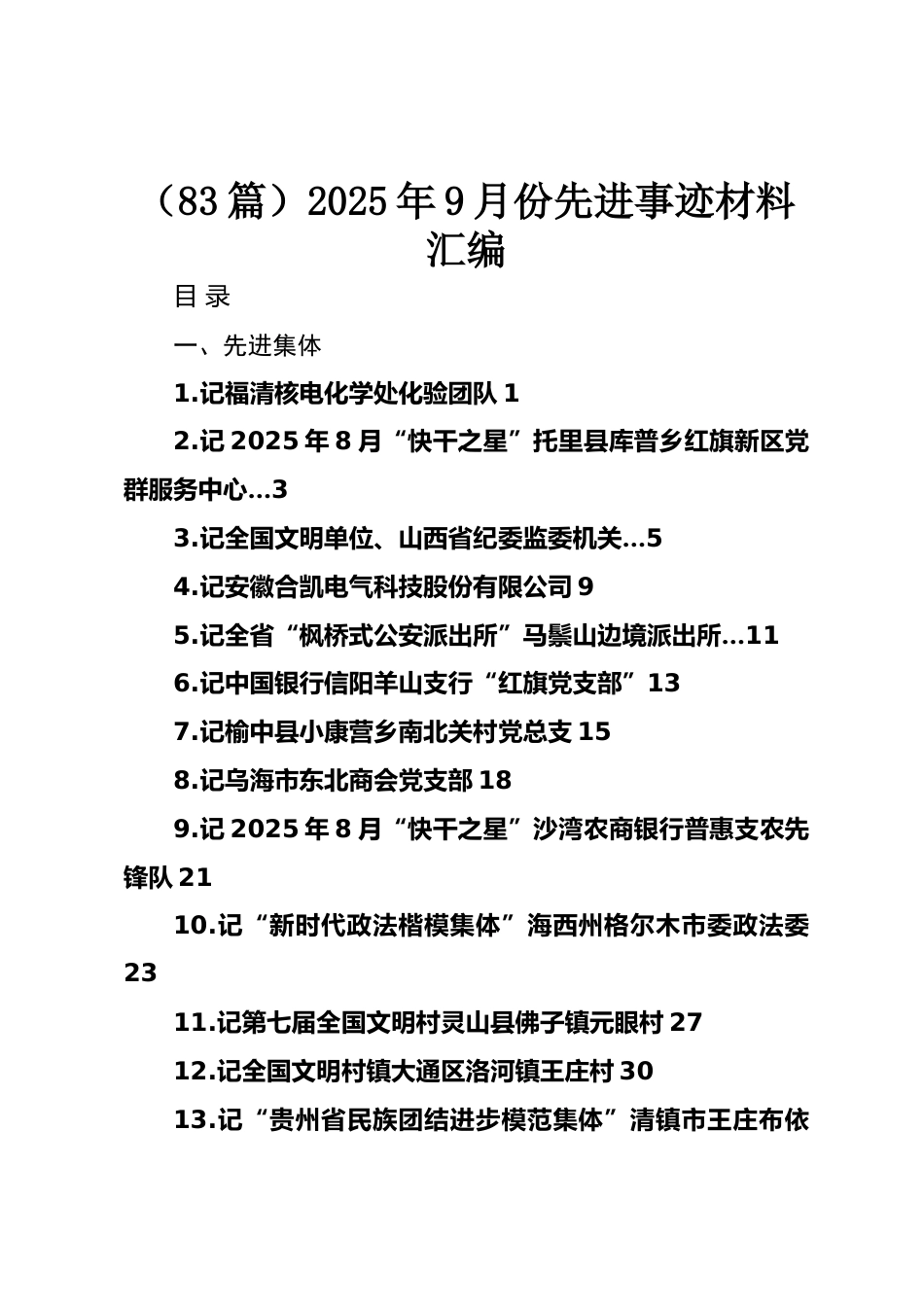 (83篇)2025年9月份先進事跡材料匯編目錄一、先進集體1.記福清核電化學處化驗團隊12.記2025年8月“快干之星”托里縣庫普鄉(xiāng)紅旗新區(qū)黨群服務中心…33.記全國文明單位、山西省紀委監(jiān)委機關…54.記安徽合凱電氣科技股份有限公司95.記全省“楓橋式公安派出所”馬鬃山邊境派出所…116.記中國銀行信陽羊山支行“紅旗黨支部”137.記榆中縣小康營鄉(xiāng)南北關村黨總支158.記烏海市東北商會黨支部189.記2025年8月“快干之星”沙灣農(nóng)商銀行普惠支農(nóng)先鋒隊2110.記“新時代政法楷模集體”海西州格爾木市委政法委2311.記第七屆全國文明村靈山縣佛子鎮(zhèn)元眼村2712.記全國文明村鎮(zhèn)大通區(qū)洛河...
