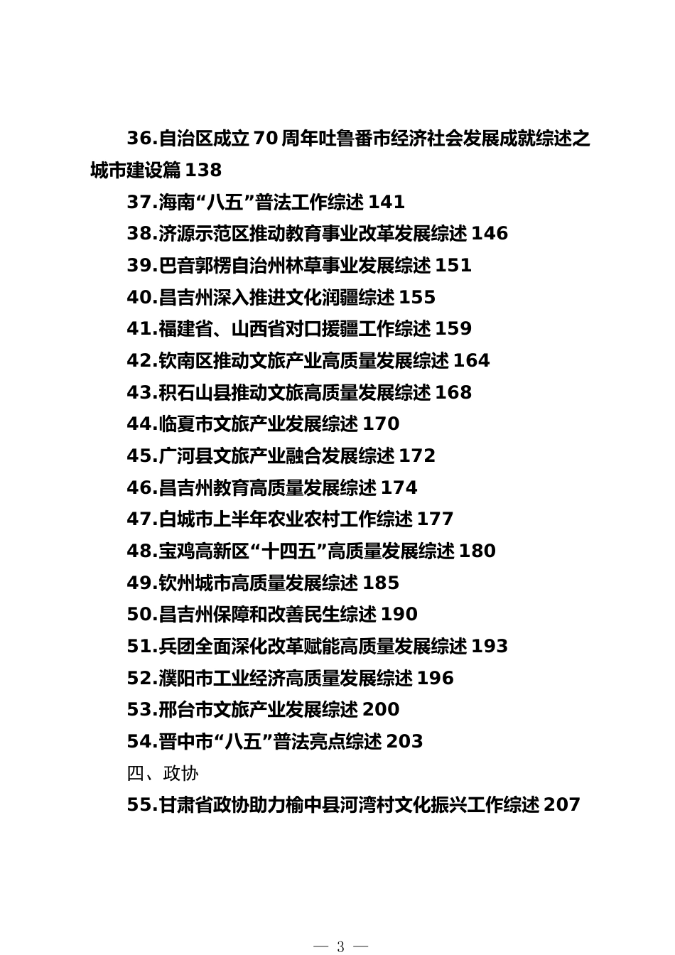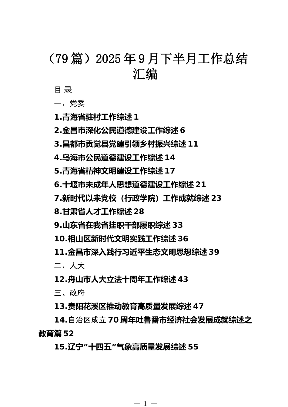 (79篇)2025年9月下半月工作總結(jié)匯編目錄一、黨委1.青海省駐村工作綜述12.金昌市深化公民道德建設(shè)工作綜述63.昌都市貢覺縣黨建引領(lǐng)鄉(xiāng)村振興綜述114.烏海市公民道德建設(shè)工作綜述145.青海省精神文明建設(shè)工作綜述176.十堰市未成年人思想道德建設(shè)工作綜述217.新時代以來黨校(行政學院)工作成就綜述238.甘肅省人才工作綜述289.山東省在我省掛職干部履職綜述3310.相山區(qū)新時代文明實踐工作綜述3611.金昌市深入踐行習近平生態(tài)文明思想綜述39二、人大12.舟山市人大立法十周年工作綜述43三、政府13.貴陽花溪區(qū)推動教育高質(zhì)量發(fā)展綜述4714.自治區(qū)成立70周年吐魯番市經(jīng)濟社會發(fā)展...
