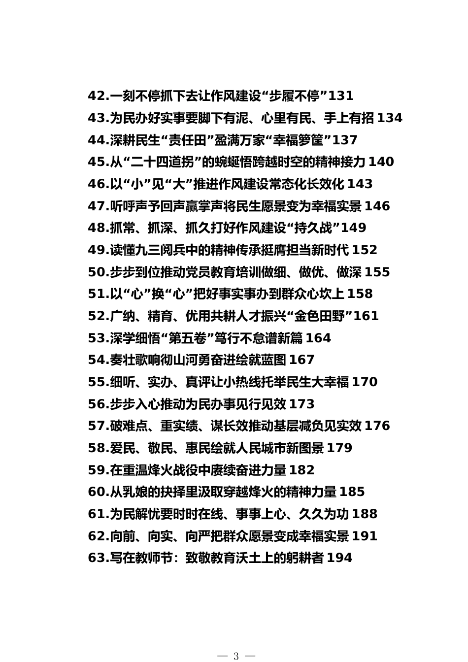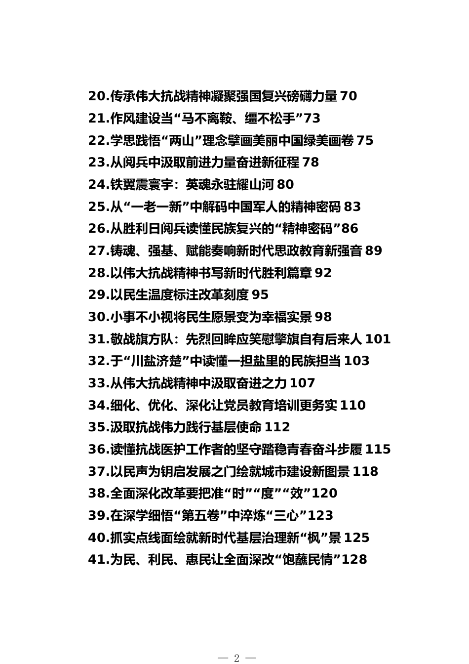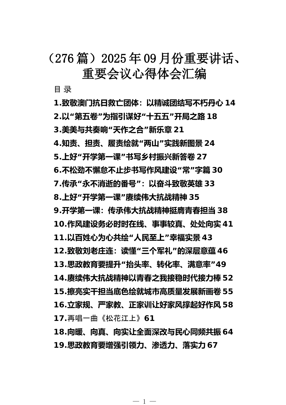 (276篇)2025年09月份重要講話、重要會議心得體會匯編目錄1.致敬澳門抗日救亡團體:以精誠團結(jié)寫不朽丹心142.“”“”以第五卷為指引謀好十五五開局之路183.“”美美與共奏響天作之合新樂章214.“”知責(zé)、擔(dān)責(zé)、履責(zé)繪就兩山實踐新圖景245.“”上好開學(xué)第一課書寫鄉(xiāng)村振興新答卷276.“”不松勁不懈怠不止步書寫作風(fēng)建設(shè)常字篇307.“”傳承永不消逝的番號:以奮斗致敬英雄338.“”上好開學(xué)第一課賡續(xù)偉大抗戰(zhàn)精神359.開學(xué)第一課:傳承偉大抗戰(zhàn)精神挺膺青春擔(dān)當3810.作風(fēng)建設(shè)務(wù)必時時在線、事事較真、處處向?qū)?111.“”以百姓心為心共繪人民至上幸福實景4312.“”致敬劉老...