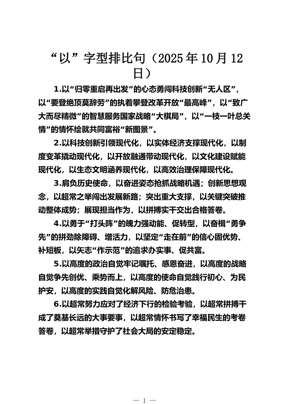 “以”字型排比句(2025年10月12日)1.“”“”以歸零重啟再出發(fā)的心態(tài)勇闖科技創(chuàng)新無人區(qū),“”“”“以要登絕頂莫辭勞的執(zhí)著攀登改革開放最高峰,以致廣”“”“大而盡精微的智慧服務(wù)國家戰(zhàn)略大棋局,以一枝一葉總關(guān)”“”情的情懷繪就共同富裕新圖景。2.以科技創(chuàng)新引領(lǐng)現(xiàn)代化,以實體經(jīng)濟支撐現(xiàn)代化,以制度變革撬動現(xiàn)代化,以開放融通帶動現(xiàn)代化,以文化建設(shè)賦能現(xiàn)代化,以生態(tài)文明涵養(yǎng)現(xiàn)代化,以高效治理保障現(xiàn)代化。3.肩負歷史使命,以奮進姿態(tài)搶抓戰(zhàn)略機遇;創(chuàng)新思想觀念,以超常之舉闖出發(fā)展新路;突出重大支撐,以關(guān)鍵突破推動整體成勢;展現(xiàn)擔(dān)當作為,以拼搏實...