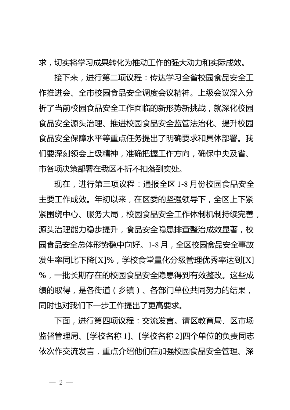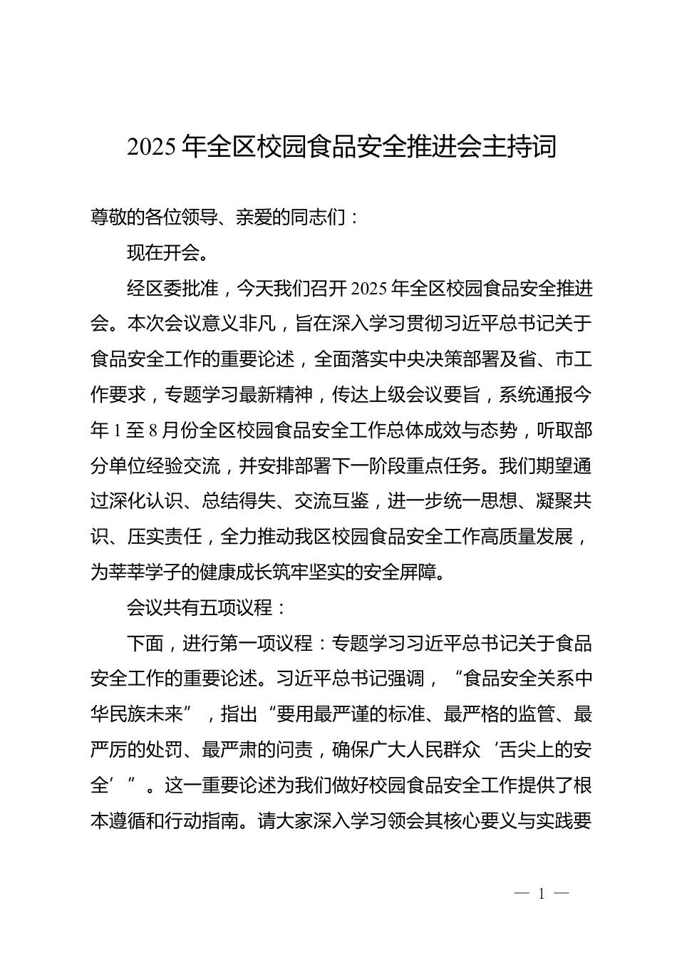 2025年全區(qū)校園食品安全推進會主持詞尊敬的各位領(lǐng)導、親愛的同志們:現(xiàn)在開會。經(jīng)區(qū)委批準,今天我們召開2025年全區(qū)校園食品安全推進會。本次會議意義非凡,旨在深入學習貫徹習近平總書記關(guān)于食品安全工作的重要論述,全面落實中央決策部署及省、市工作要求,專題學習最新精神,傳達上級會議要旨,系統(tǒng)通報今年1至8月份全區(qū)校園食品安全工作總體成效與態(tài)勢,聽取部分單位經(jīng)驗交流,并安排部署下一階段重點任務。我們期望通過深化認識、總結(jié)得失、交流互鑒,進一步統(tǒng)一思想、凝聚共識、壓實責任,全力推動我區(qū)校園食品安全工作高質(zhì)量發(fā)展,為莘莘學子的健康成長筑牢堅實的...