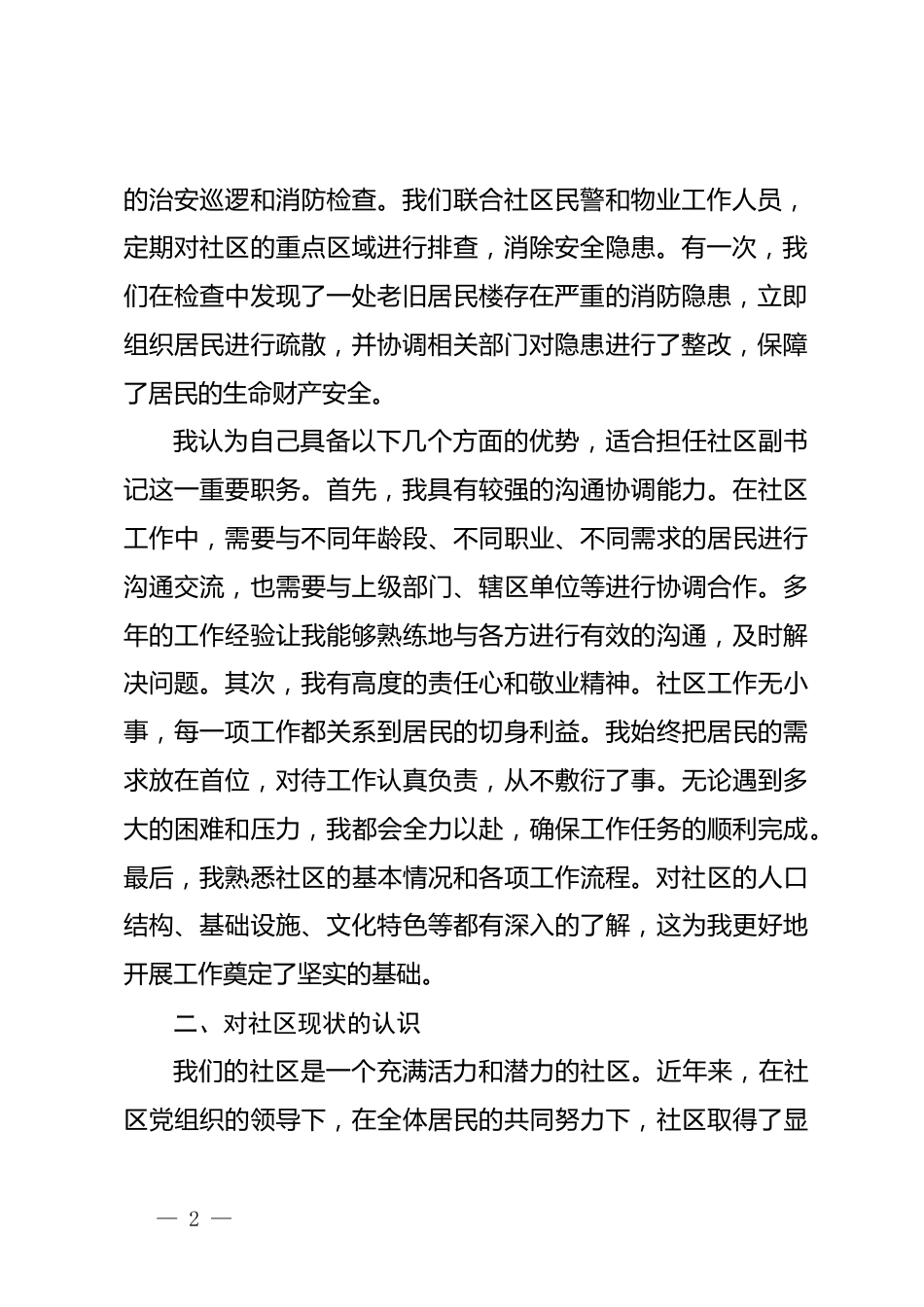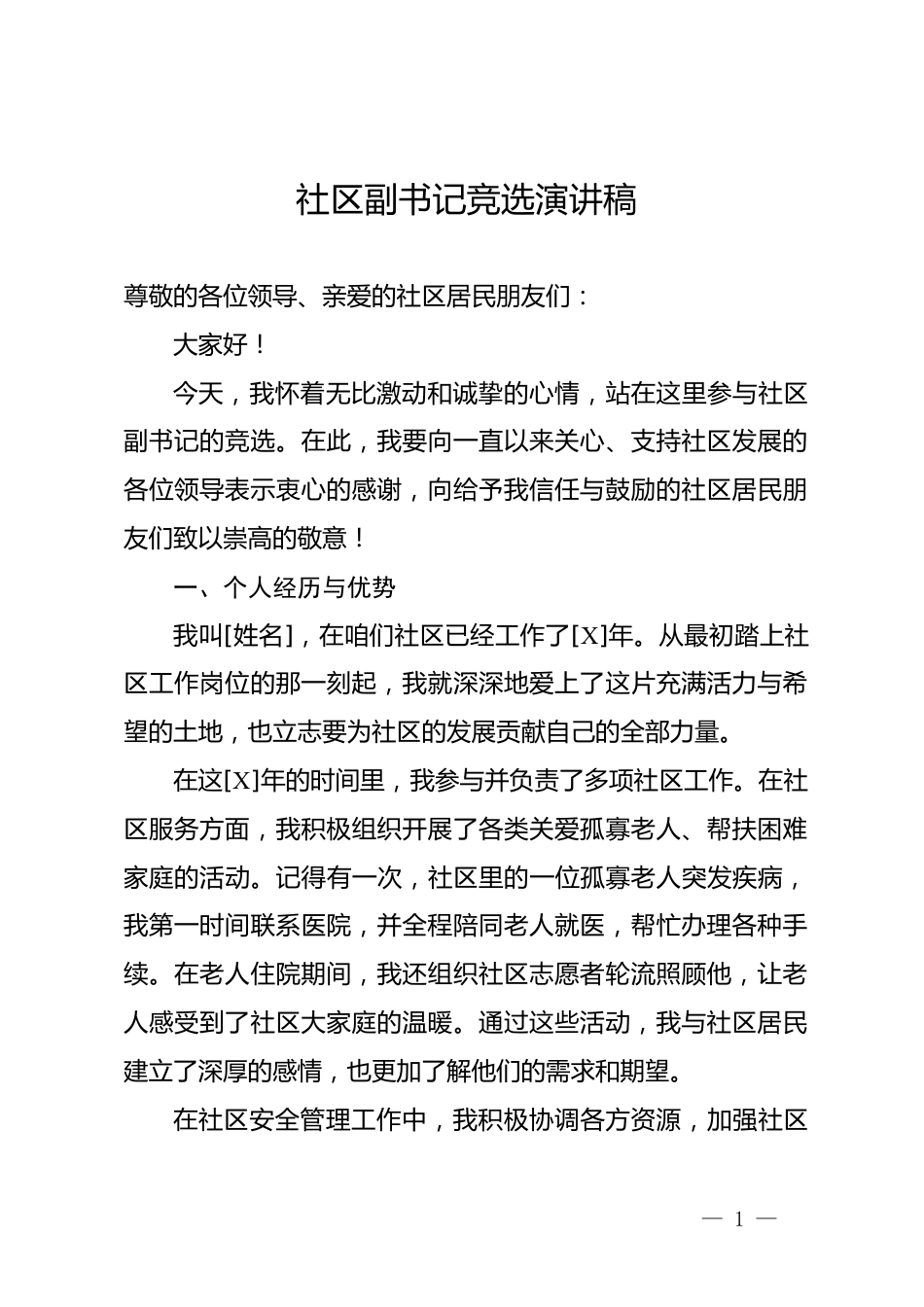 社區(qū)副書記競選演講稿尊敬的各位領導、親愛的社區(qū)居民朋友們:大家好!今天,我懷著無比激動和誠摯的心情,站在這里參與社區(qū)副書記的競選。在此,我要向一直以來關心、支持社區(qū)發(fā)展的各位領導表示衷心的感謝,向給予我信任與鼓勵的社區(qū)居民朋友們致以崇高的敬意!一、個人經(jīng)歷與優(yōu)勢我叫[姓名],在咱們社區(qū)已經(jīng)工作了[X]年。從最初踏上社區(qū)工作崗位的那一刻起,我就深深地愛上了這片充滿活力與希望的土地,也立志要為社區(qū)的發(fā)展貢獻自己的全部力量。在這[X]年的時間里,我參與并負責了多項社區(qū)工作。在社區(qū)服務方面,我積極組織開展了各類關愛孤寡老人、幫扶困難家庭的活...