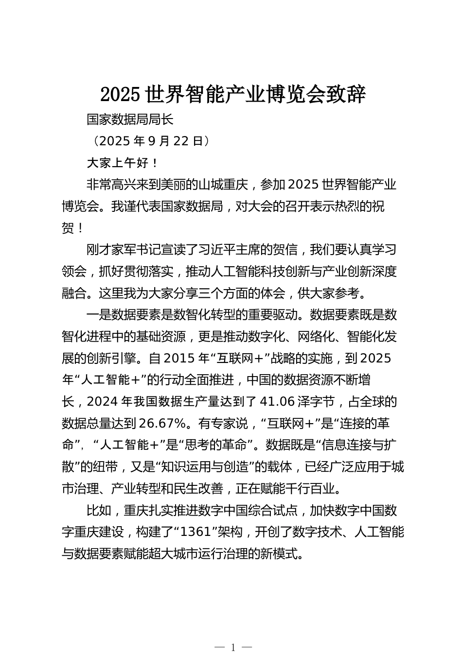 2025世界智能產(chǎn)業(yè)博覽會致辭國家數(shù)據(jù)局局長(2025年9月22日)大家上午好!非常高興來到美麗的山城重慶,參加2025世界智能產(chǎn)業(yè)博覽會。我謹代表國家數(shù)據(jù)局,對大會的召開表示熱烈的祝賀!剛才家軍書記宣讀了習近平主席的賀信,我們要認真學(xué)習領(lǐng)會,抓好貫徹落實,推動人工智能科技創(chuàng)新與產(chǎn)業(yè)創(chuàng)新深度融合。這里我為大家分享三個方面的體會,供大家參考。一是數(shù)據(jù)要素是數(shù)智化轉(zhuǎn)型的重要驅(qū)動。數(shù)據(jù)要素既是數(shù)智化進程中的基礎(chǔ)資源,更是推動數(shù)字化、網(wǎng)絡(luò)化、智能化發(fā)展的創(chuàng)新引擎。自2015“年互聯(lián)網(wǎng)+”戰(zhàn)略的實施,到2025“年人工智能+”的行動全面推進,中國的數(shù)據(jù)資源不...