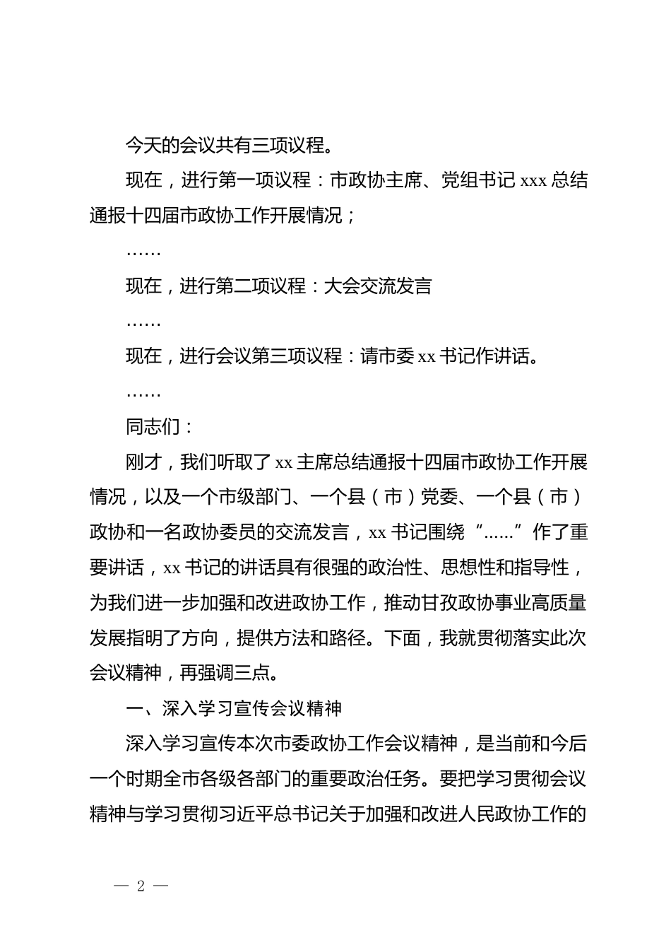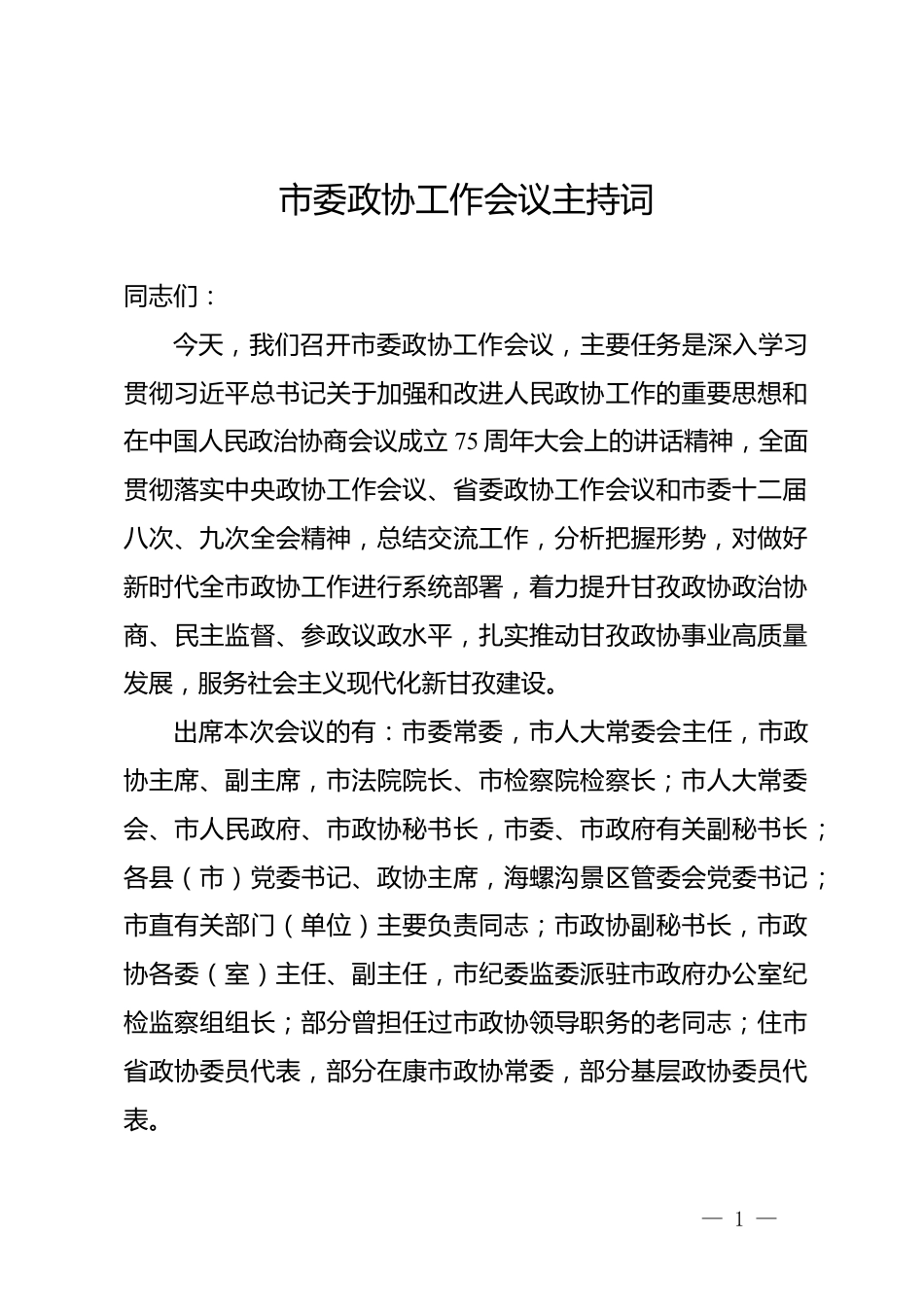 市委政協(xié)工作會(huì)議主持詞同志們:今天,我們召開(kāi)市委政協(xié)工作會(huì)議,主要任務(wù)是深入學(xué)習(xí)貫徹習(xí)近平總書(shū)記關(guān)于加強(qiáng)和改進(jìn)人民政協(xié)工作的重要思想和在中國(guó)人民政治協(xié)商會(huì)議成立75周年大會(huì)上的講話(huà)精神,全面貫徹落實(shí)中央政協(xié)工作會(huì)議、省委政協(xié)工作會(huì)議和市委十二屆八次、九次全會(huì)精神,總結(jié)交流工作,分析把握形勢(shì),對(duì)做好新時(shí)代全市政協(xié)工作進(jìn)行系統(tǒng)部署,著力提升甘孜政協(xié)政治協(xié)商、民主監(jiān)督、參政議政水平,扎實(shí)推動(dòng)甘孜政協(xié)事業(yè)高質(zhì)量發(fā)展,服務(wù)社會(huì)主義現(xiàn)代化新甘孜建設(shè)。出席本次會(huì)議的有:市委常委,市人大常委會(huì)主任,市政協(xié)主席、副主席,市法院院長(zhǎng)、市檢察院檢察...