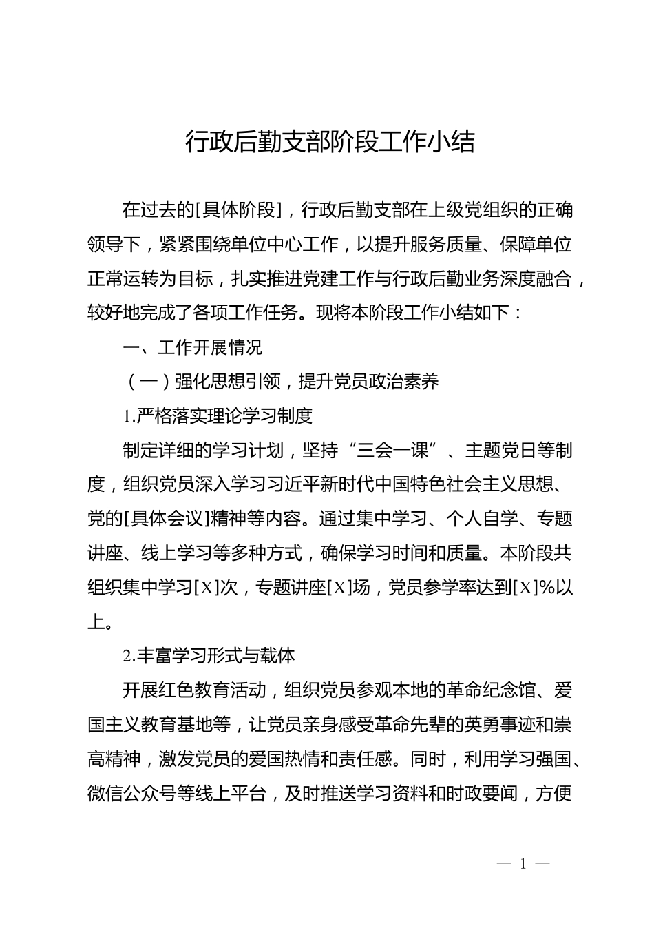 行政后勤支部階段工作小結(jié)在過去的[具體階段],行政后勤支部在上級(jí)黨組織的正確領(lǐng)導(dǎo)下,緊緊圍繞單位中心工作,以提升服務(wù)質(zhì)量、保障單位正常運(yùn)轉(zhuǎn)為目標(biāo),扎實(shí)推進(jìn)黨建工作與行政后勤業(yè)務(wù)深度融合,較好地完成了各項(xiàng)工作任務(wù)。現(xiàn)將本階段工作小結(jié)如下:一、工作開展情況(一)強(qiáng)化思想引領(lǐng),提升黨員政治素養(yǎng)1.嚴(yán)格落實(shí)理論學(xué)習(xí)制度制定詳細(xì)的學(xué)習(xí)計(jì)劃,堅(jiān)持“三會(huì)一課”、主題黨日等制度,組織黨員深入學(xué)習(xí)習(xí)近平新時(shí)代中國特色社會(huì)主義思想、黨的[具體會(huì)議]精神等內(nèi)容。通過集中學(xué)習(xí)、個(gè)人自學(xué)、專題講座、線上學(xué)習(xí)等多種方式,確保學(xué)習(xí)時(shí)間和質(zhì)量。本階段共組織集中學(xué)...