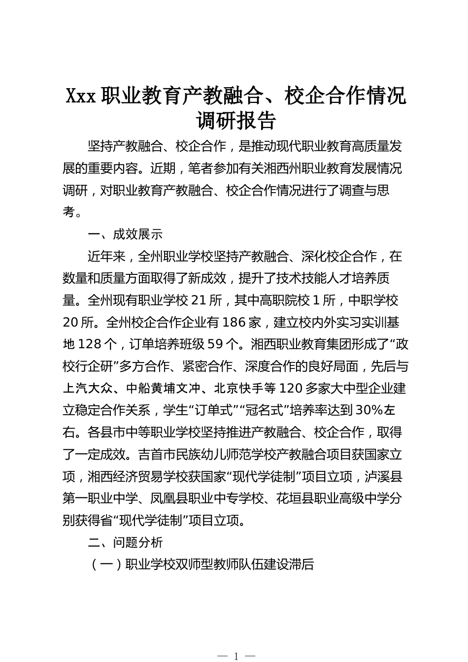 Xxx職業(yè)教育產(chǎn)教融合、校企合作情況調(diào)研報(bào)告堅(jiān)持產(chǎn)教融合、校企合作,是推動(dòng)現(xiàn)代職業(yè)教育高質(zhì)量發(fā)展的重要內(nèi)容。近期,筆者參加有關(guān)湘西州職業(yè)教育發(fā)展情況調(diào)研,對(duì)職業(yè)教育產(chǎn)教融合、校企合作情況進(jìn)行了調(diào)查與思考。一、成效展示近年來,全州職業(yè)學(xué)校堅(jiān)持產(chǎn)教融合、深化校企合作,在數(shù)量和質(zhì)量方面取得了新成效,提升了技術(shù)技能人才培養(yǎng)質(zhì)量。全州現(xiàn)有職業(yè)學(xué)校21所,其中高職院校1所,中職學(xué)校20所。全州校企合作企業(yè)有186家,建立校內(nèi)外實(shí)習(xí)實(shí)訓(xùn)基地128個(gè),訂單培養(yǎng)班級(jí)59“個(gè)。湘西職業(yè)教育集團(tuán)形成了政”校行企研多方合作、緊密合作、深度合作的良好局面,先后與上汽...