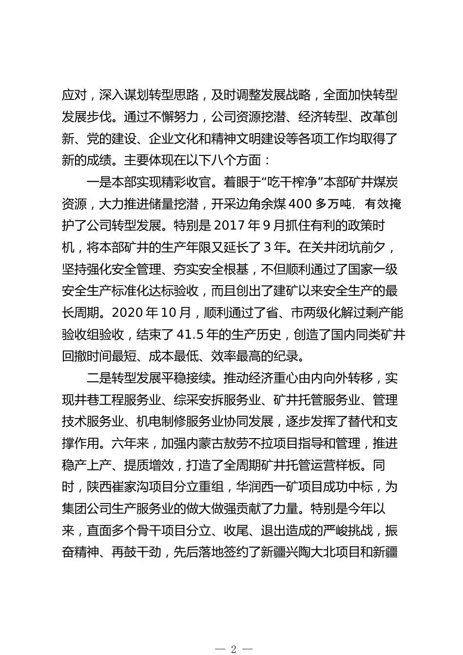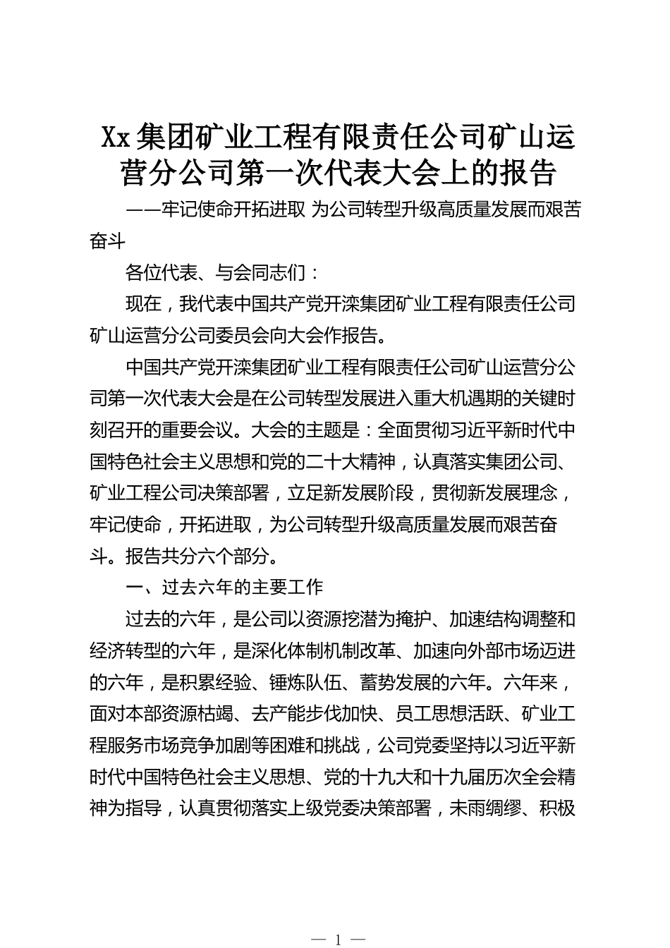 Xx集團礦業(yè)工程有限責(zé)任公司礦山運營分公司第一次代表大會上的報告——牢記使命開拓進取為公司轉(zhuǎn)型升級高質(zhì)量發(fā)展而艱苦奮斗各位代表、與會同志們:現(xiàn)在,我代表中國共產(chǎn)黨開灤集團礦業(yè)工程有限責(zé)任公司礦山運營分公司委員會向大會作報告。中國共產(chǎn)黨開灤集團礦業(yè)工程有限責(zé)任公司礦山運營分公司第一次代表大會是在公司轉(zhuǎn)型發(fā)展進入重大機遇期的關(guān)鍵時刻召開的重要會議。大會的主題是:全面貫徹習(xí)近平新時代中國特色社會主義思想和黨的二十大精神,認真落實集團公司、礦業(yè)工程公司決策部署,立足新發(fā)展階段,貫徹新發(fā)展理念,牢記使命,開拓進取,為公司轉(zhuǎn)型升級高質(zhì)量發(fā)...