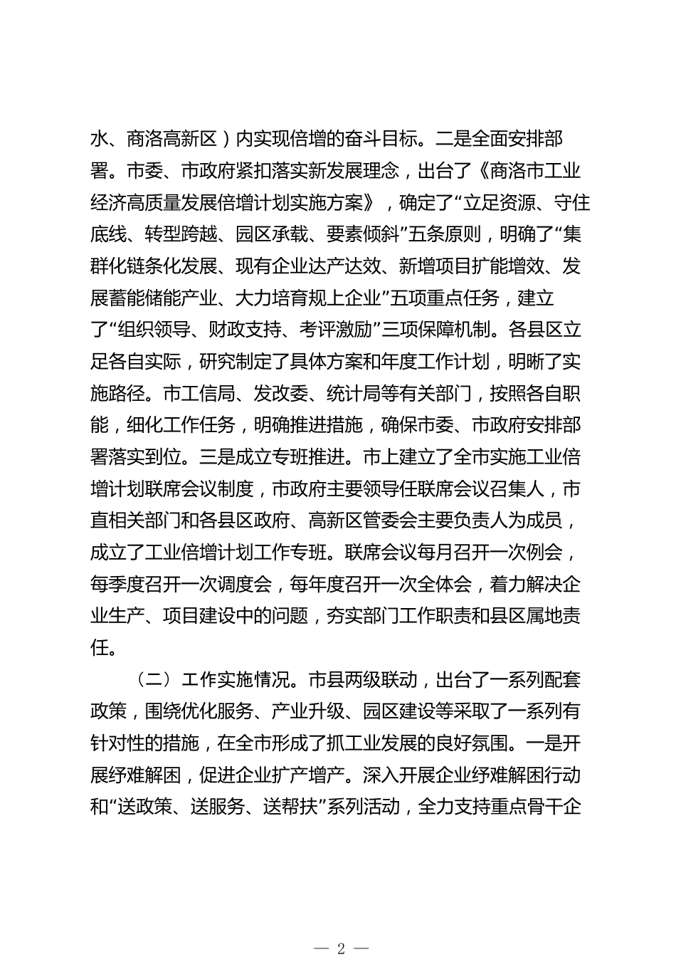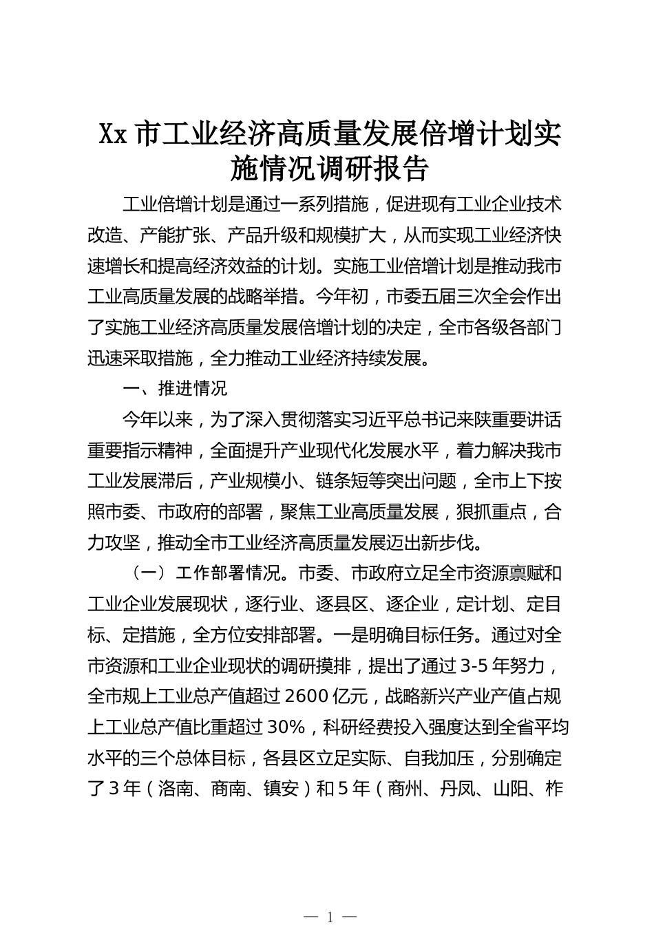 Xx市工業(yè)經(jīng)濟(jì)高質(zhì)量發(fā)展倍增計(jì)劃實(shí)施情況調(diào)研報(bào)告工業(yè)倍增計(jì)劃是通過(guò)一系列措施,促進(jìn)現(xiàn)有工業(yè)企業(yè)技術(shù)改造、產(chǎn)能擴(kuò)張、產(chǎn)品升級(jí)和規(guī)模擴(kuò)大,從而實(shí)現(xiàn)工業(yè)經(jīng)濟(jì)快速增長(zhǎng)和提高經(jīng)濟(jì)效益的計(jì)劃。實(shí)施工業(yè)倍增計(jì)劃是推動(dòng)我市工業(yè)高質(zhì)量發(fā)展的戰(zhàn)略舉措。今年初,市委五屆三次全會(huì)作出了實(shí)施工業(yè)經(jīng)濟(jì)高質(zhì)量發(fā)展倍增計(jì)劃的決定,全市各級(jí)各部門迅速采取措施,全力推動(dòng)工業(yè)經(jīng)濟(jì)持續(xù)發(fā)展。一、推進(jìn)情況今年以來(lái),為了深入貫徹落實(shí)習(xí)近平總書記來(lái)陜重要講話重要指示精神,全面提升產(chǎn)業(yè)現(xiàn)代化發(fā)展水平,著力解決我市工業(yè)發(fā)展滯后,產(chǎn)業(yè)規(guī)模小、鏈條短等突出問(wèn)題,全市上下按照市委、...