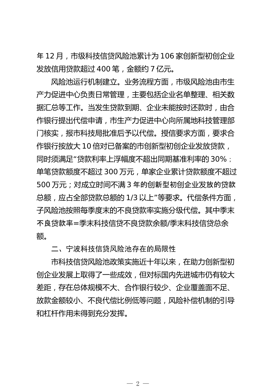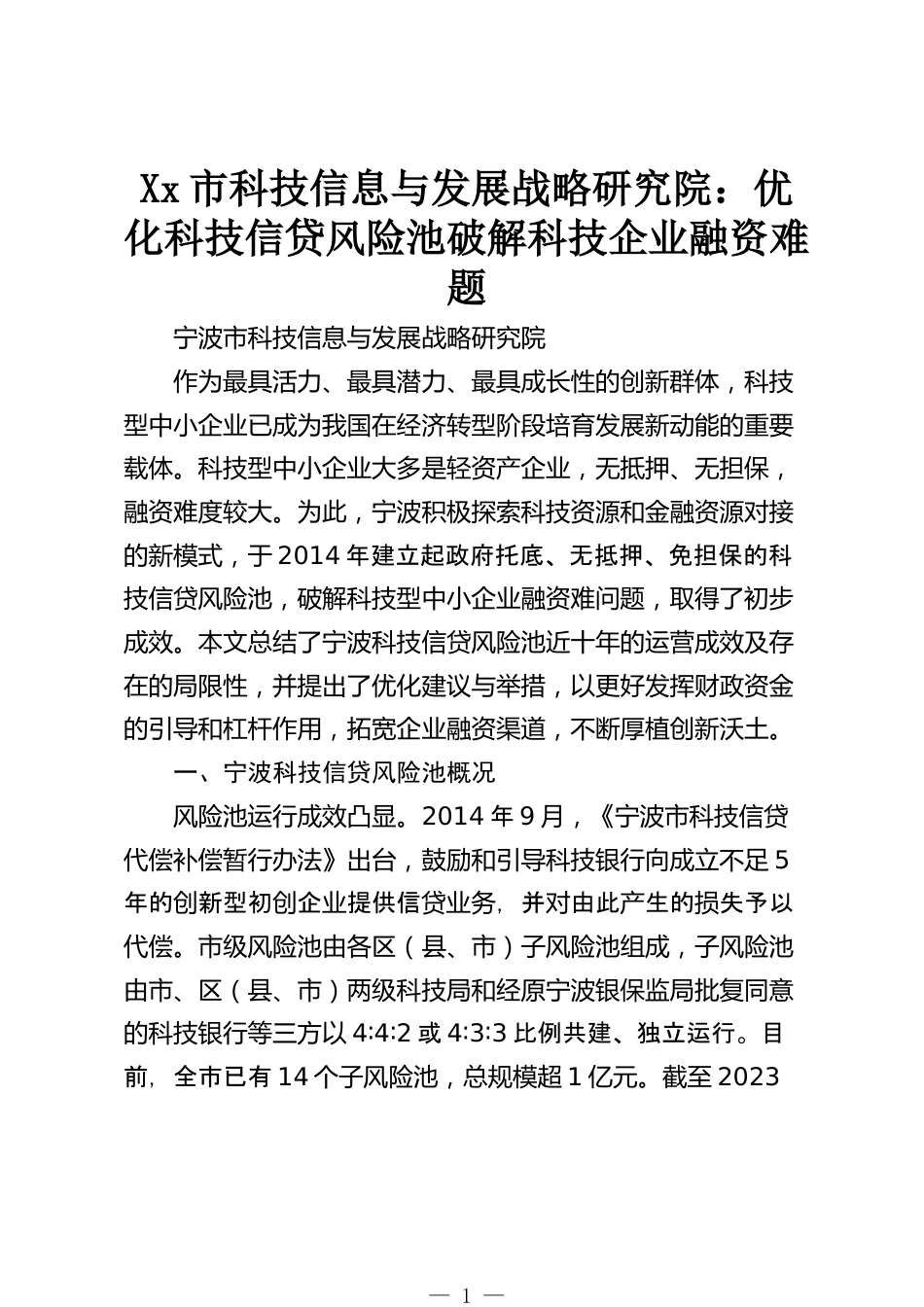Xx市科技信息與發(fā)展戰(zhàn)略研究院:優(yōu)化科技信貸風(fēng)險(xiǎn)池破解科技企業(yè)融資難題寧波市科技信息與發(fā)展戰(zhàn)略研究院作為最具活力、最具潛力、最具成長(zhǎng)性的創(chuàng)新群體,科技型中小企業(yè)已成為我國(guó)在經(jīng)濟(jì)轉(zhuǎn)型階段培育發(fā)展新動(dòng)能的重要載體??萍夹椭行∑髽I(yè)大多是輕資產(chǎn)企業(yè),無(wú)抵押、無(wú)擔(dān)保,融資難度較大。為此,寧波積極探索科技資源和金融資源對(duì)接的新模式,于2014年建立起政府托底、無(wú)抵押、免擔(dān)保的科技信貸風(fēng)險(xiǎn)池,破解科技型中小企業(yè)融資難問(wèn)題,取得了初步成效。本文總結(jié)了寧波科技信貸風(fēng)險(xiǎn)池近十年的運(yùn)營(yíng)成效及存在的局限性,并提出了優(yōu)化建議與舉措,以更好發(fā)揮財(cái)政資金的引導(dǎo)...