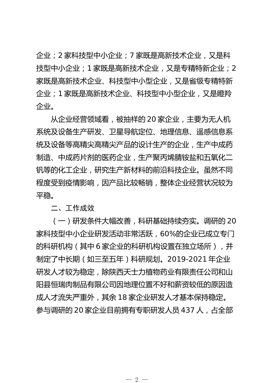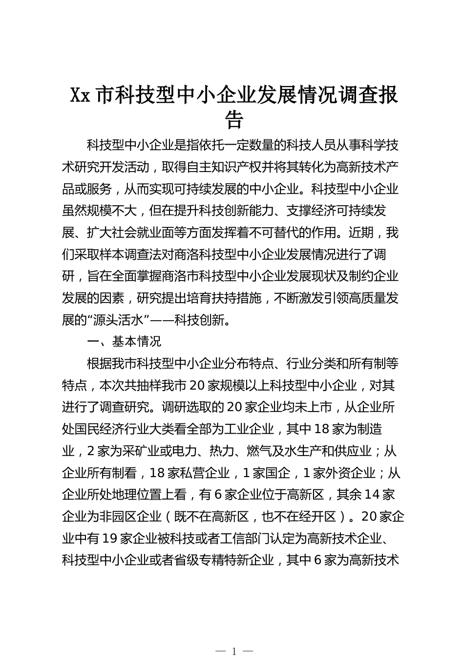 Xx市科技型中小企業(yè)發(fā)展情況調(diào)查報告科技型中小企業(yè)是指依托一定數(shù)量的科技人員從事科學(xué)技術(shù)研究開發(fā)活動,取得自主知識產(chǎn)權(quán)并將其轉(zhuǎn)化為高新技術(shù)產(chǎn)品或服務(wù),從而實現(xiàn)可持續(xù)發(fā)展的中小企業(yè)??萍夹椭行∑髽I(yè)雖然規(guī)模不大,但在提升科技創(chuàng)新能力、支撐經(jīng)濟(jì)可持續(xù)發(fā)展、擴(kuò)大社會就業(yè)面等方面發(fā)揮著不可替代的作用。近期,我們采取樣本調(diào)查法對商洛科技型中小企業(yè)發(fā)展情況進(jìn)行了調(diào)研,旨在全面掌握商洛市科技型中小企業(yè)發(fā)展現(xiàn)狀及制約企業(yè)發(fā)展的因素,研究提出培育扶持措施,不斷激發(fā)引領(lǐng)高質(zhì)量發(fā)“展的源頭活水”——科技創(chuàng)新。一、基本情況根據(jù)我市科技型中小企業(yè)分布特點...