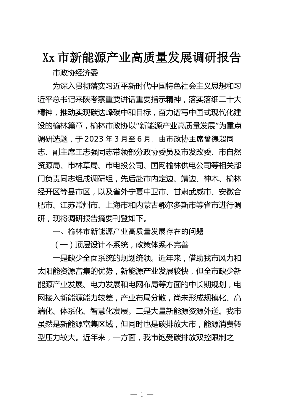 Xx市新能源產(chǎn)業(yè)高質(zhì)量發(fā)展調(diào)研報(bào)告市政協(xié)經(jīng)濟(jì)委為深入貫徹落實(shí)習(xí)近平新時(shí)代中國特色社會主義思想和習(xí)近平總書記來陜考察重要講話重要指示精神,落實(shí)落細(xì)二十大精神,推動實(shí)現(xiàn)碳達(dá)峰碳中和目標(biāo),奮力譜寫中國式現(xiàn)代化建“”設(shè)的榆林篇章,榆林市政協(xié)以新能源產(chǎn)業(yè)高質(zhì)量發(fā)展為重點(diǎn)調(diào)研選題,于2023年3月至6月,由市政主席曾德超同協(xié)志、副主席王志強(qiáng)同志帶領(lǐng)部分政協(xié)委員及市發(fā)改委、市自然資源局、市林草局、市電投公司、國網(wǎng)榆林供電公司等相關(guān)部門負(fù)責(zé)同志組成調(diào)研組,先后赴市內(nèi)定邊、靖邊、神木、榆林經(jīng)開區(qū)等縣市區(qū),以及省外寧夏中衛(wèi)市、甘肅武威市、安徽合肥市、江...