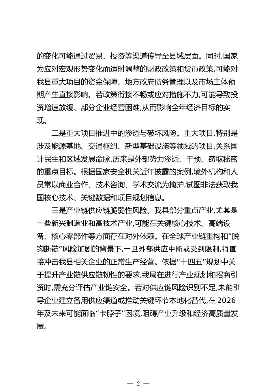 XX縣發(fā)展和改革局2026年度國家安全風(fēng)險(xiǎn)評估報(bào)告根據(jù)《中華人民共和國國家安全法》及上級有關(guān)工作要求,為準(zhǔn)確把握新形勢下我縣發(fā)展和改革領(lǐng)域面臨的國家安全挑戰(zhàn),切實(shí)防范化解重大風(fēng)險(xiǎn),我局結(jié)合職能職責(zé),聚焦經(jīng)濟(jì)、糧食、能源等關(guān)鍵領(lǐng)域,對2026年可能面臨的國家安全風(fēng)險(xiǎn)進(jìn)行了綜合研判。報(bào)告如下:一、2026年本部門國家安全總體形勢與風(fēng)險(xiǎn)評估當(dāng)前,國際環(huán)境日趨復(fù)雜,全球經(jīng)濟(jì)增長預(yù)期放緩,地緣政治沖突和供應(yīng)鏈擾動(dòng)等不確定性因素增多。根據(jù)國際貨幣基金組織的預(yù)測,2025年至2026年全球經(jīng)濟(jì)增速仍面臨下行壓力。國內(nèi)經(jīng)濟(jì)持續(xù)回升向好,但基礎(chǔ)尚不穩(wěn)固,發(fā)展不平衡不充分問題依...