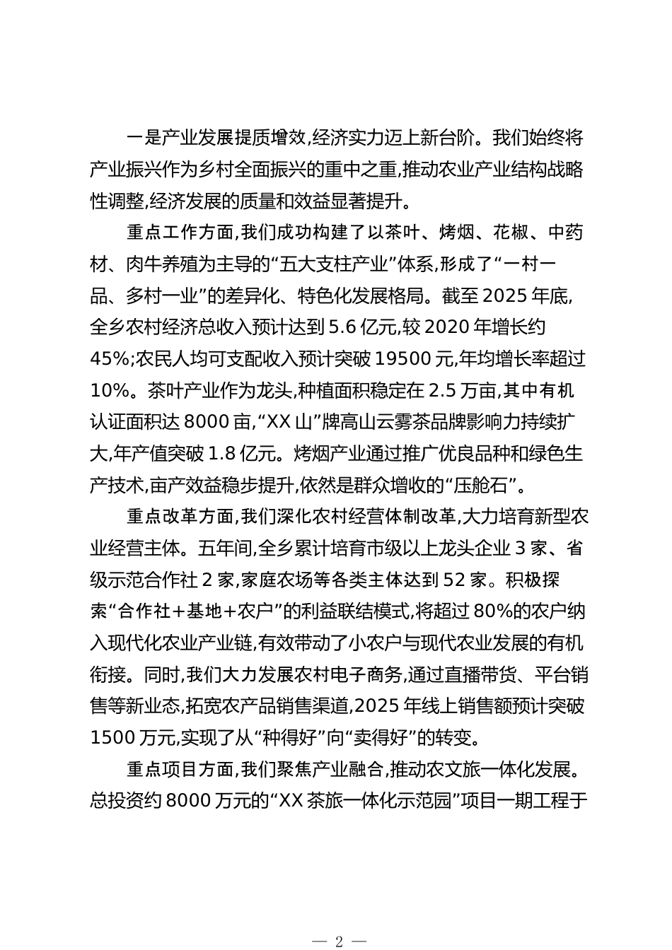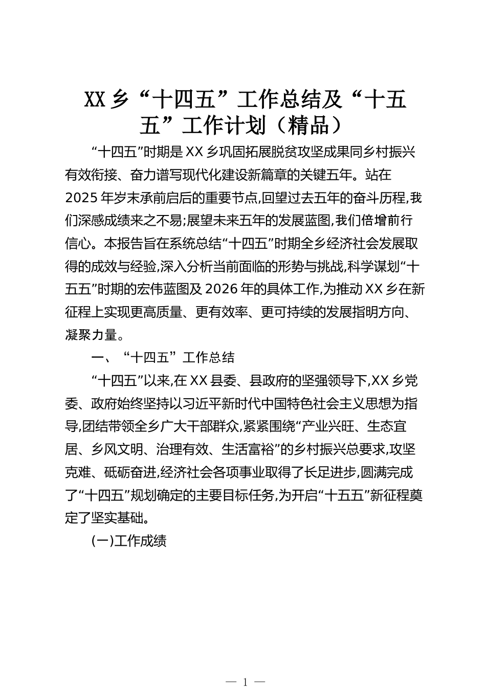 XX鄉(xiāng)“十四五”工作總結及“十五五”工作計劃(精品)“”十四五時期是XX鄉(xiāng)鞏固拓展脫貧攻堅成果同鄉(xiāng)村振興有效銜接、奮力譜寫現代化建設新篇章的關鍵五年。站在2025年歲末承前啟后的重要節(jié)點,回望過去五年的奮斗歷程,我們深感成績來之不易;展望未來五年的發(fā)展藍圖,我倍增前行們“”信心。本報告旨在系統(tǒng)總結十四五時期全鄉(xiāng)經濟社會發(fā)展取得的成效與經驗,深入分析當前面臨的形勢與挑戰(zhàn),“科學謀劃十”五五時期的宏偉藍圖及2026年的具體工作,為推動XX鄉(xiāng)在新征程上實現更高質量、更有效率、更可持續(xù)的發(fā)展指明方向、凝聚力量。一、“十四五”工作總結“”十四五以來,在XX縣...