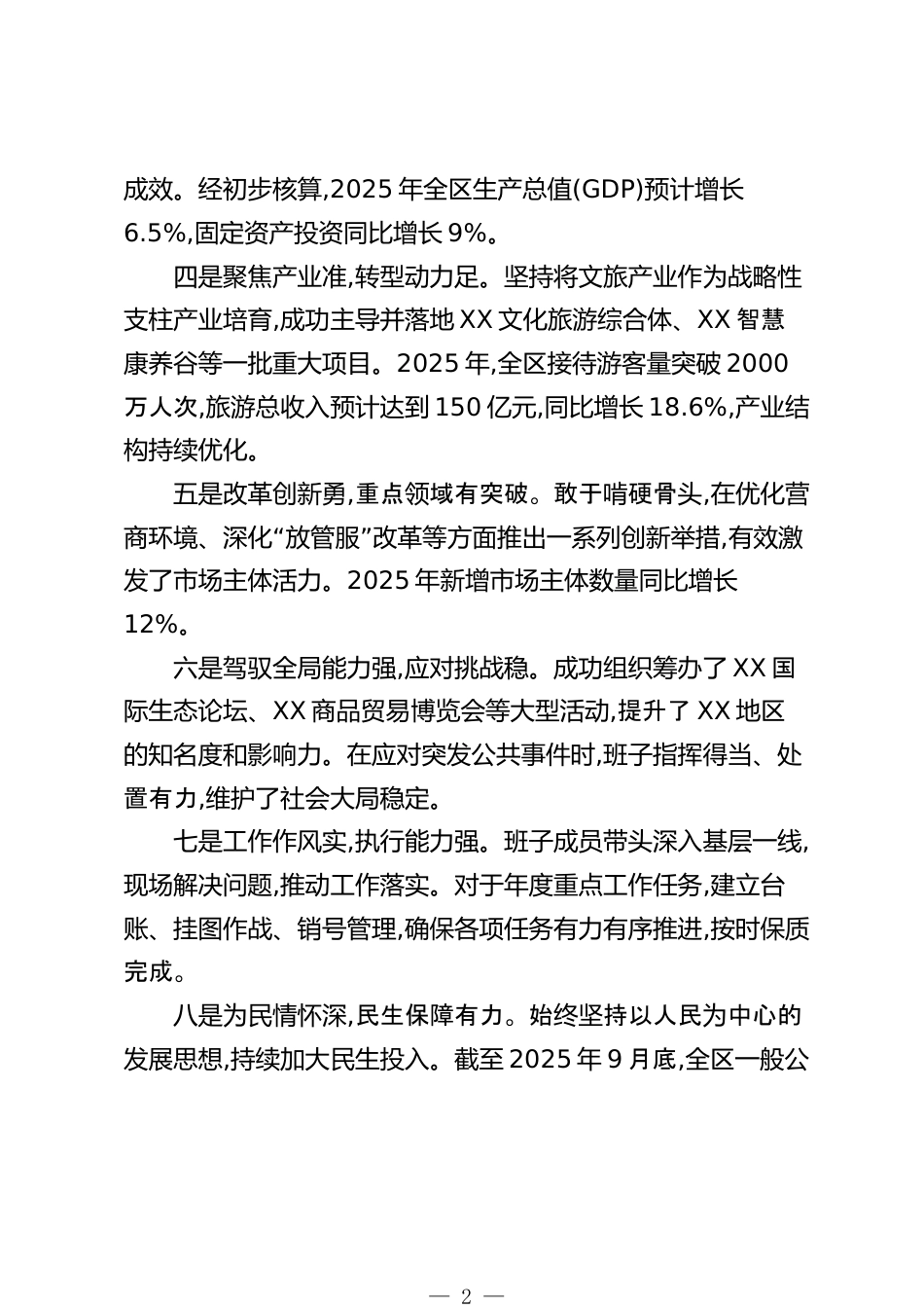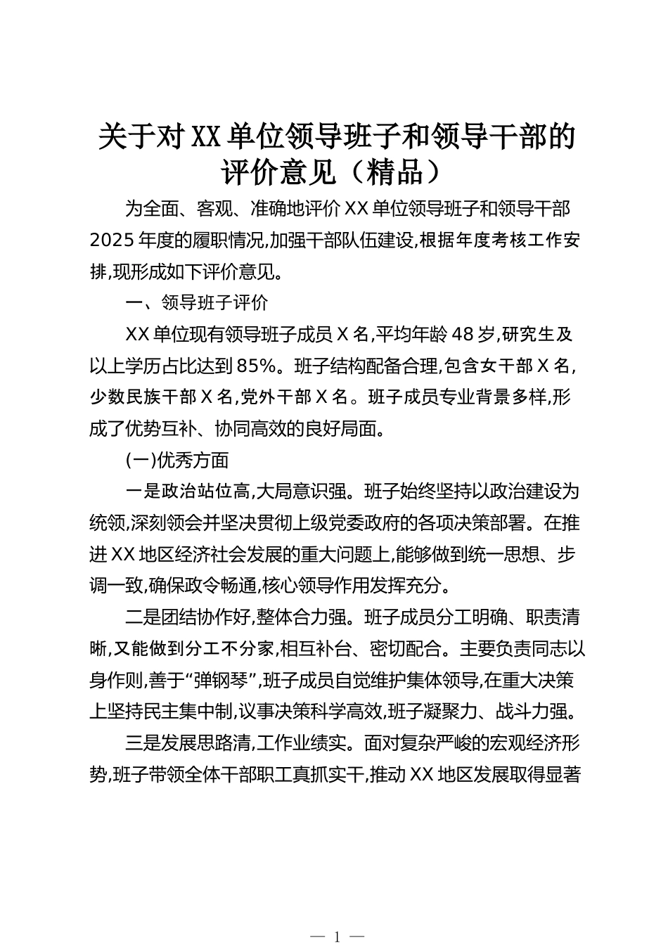 關(guān)于對(duì)XX單位領(lǐng)導(dǎo)班子和領(lǐng)導(dǎo)干部的評(píng)價(jià)意見(jiàn)(精品)為全面、客觀、準(zhǔn)確地評(píng)價(jià)XX單位領(lǐng)導(dǎo)班子和領(lǐng)導(dǎo)干部2025年度的履職情況,加強(qiáng)干部隊(duì)伍建設(shè),根據(jù)年度考核工作安排,現(xiàn)形成如下評(píng)價(jià)意見(jiàn)。一、領(lǐng)導(dǎo)班子評(píng)價(jià)XX單位現(xiàn)有領(lǐng)導(dǎo)班子成員X名,平均年齡48歲,研究生及以上學(xué)歷占比達(dá)到85%。班子結(jié)構(gòu)配備合理,包含女干部X名,少數(shù)民族干部X名,黨外干部X名。班子成員專業(yè)背景多樣,形成了優(yōu)勢(shì)互補(bǔ)、協(xié)同高效的良好局面。(一)優(yōu)秀方面一是政治站位高,大局意識(shí)強(qiáng)。班子始終堅(jiān)持以政治建設(shè)為統(tǒng)領(lǐng),深刻領(lǐng)會(huì)并堅(jiān)決貫徹上級(jí)黨委政府的各項(xiàng)決策部署。在推進(jìn)XX地區(qū)經(jīng)濟(jì)社會(huì)發(fā)展的重大問(wèn)題上,能夠...