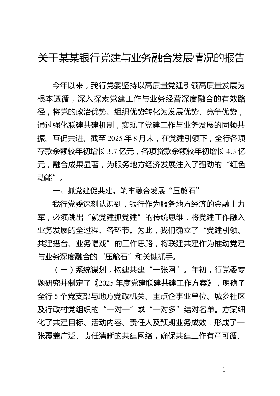 關于某某銀行黨建與業(yè)務融合發(fā)展情況的報告今年以來,我行黨委堅持以高質量黨建引領高質量發(fā)展為根本遵循,深入探索黨建工作與業(yè)務經營深度融合的有效路徑,將黨的政治優(yōu)勢、組織優(yōu)勢轉化為發(fā)展優(yōu)勢、競爭優(yōu)勢,通過強化聯(lián)建共建機制,實現(xiàn)了黨建工作與業(yè)務發(fā)展的同頻共振、互促共進。截至2025年8月末,在黨建引領下,全行各項存款余額較年初增長3.7億元,各項貸款余額較年初增長4.3億元,融合成果顯著,為服務地方經濟發(fā)展注入了強勁的“紅色動能”。一、抓黨建促共建,筑牢融合發(fā)展“壓艙石”我行黨委深刻認識到,銀行作為服務地方經濟的金融主力軍,必須跳出“就黨建...