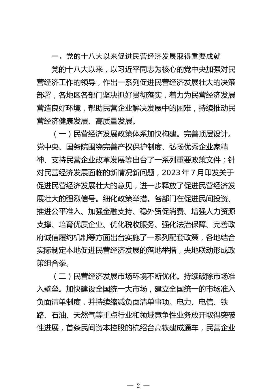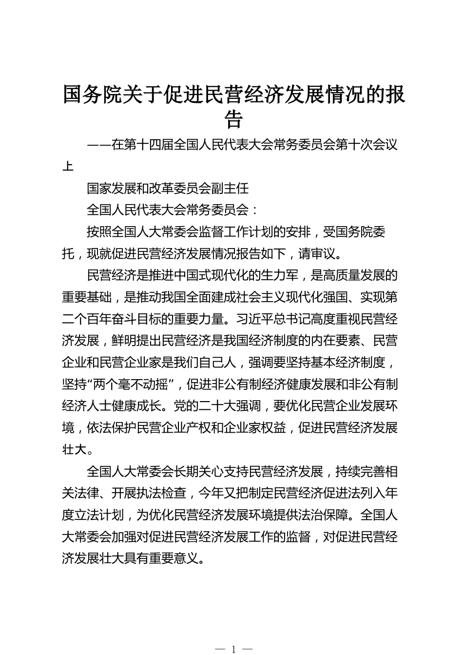 國務(wù)院關(guān)于促進(jìn)民營經(jīng)濟(jì)發(fā)展情況的報告——在第十四屆全國人民代表大會常務(wù)委員會第十次會議上國家發(fā)展和改革委員會副主任全國人民代表大會常務(wù)委員會:按照全國人大常委會監(jiān)督工作計劃的安排,受國務(wù)院委托,現(xiàn)就促進(jìn)民營經(jīng)濟(jì)發(fā)展情況報告如下,請審議。民營經(jīng)濟(jì)是推進(jìn)中國式現(xiàn)代化的生力軍,是高質(zhì)量發(fā)展的重要基礎(chǔ),是推動我國全面建成社會主義現(xiàn)代化強(qiáng)國、實現(xiàn)第二個百年奮斗目標(biāo)的重要力量。習(xí)近平總書記高度重視民營經(jīng)濟(jì)發(fā)展,鮮明提出民營經(jīng)濟(jì)是我國經(jīng)濟(jì)制度的內(nèi)在要素、民營企業(yè)和民營企業(yè)家是我們自己人,強(qiáng)調(diào)要堅持基本經(jīng)濟(jì)制度,“”堅持兩個毫不動搖,促進(jìn)非...