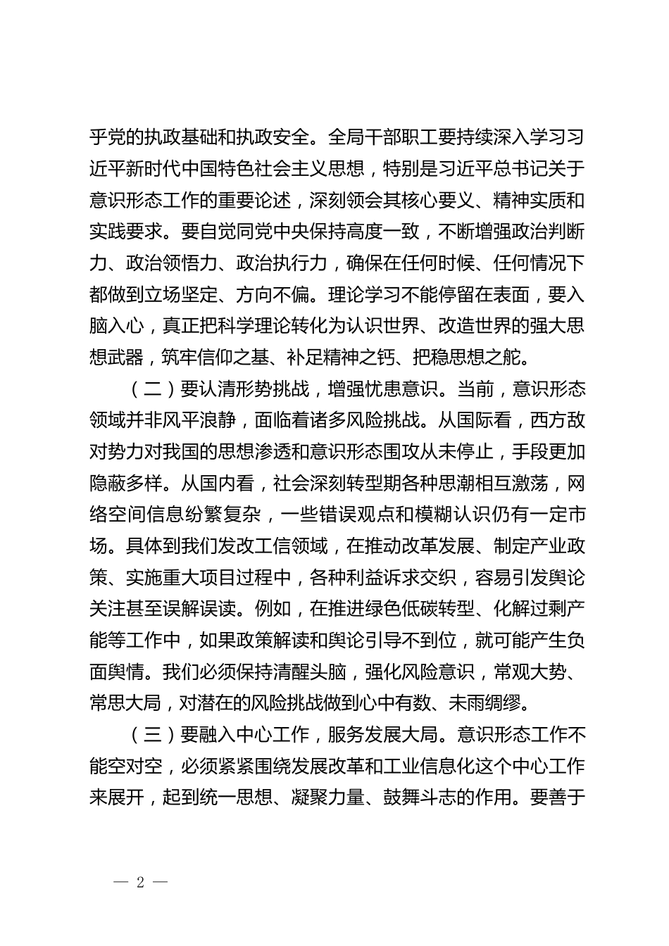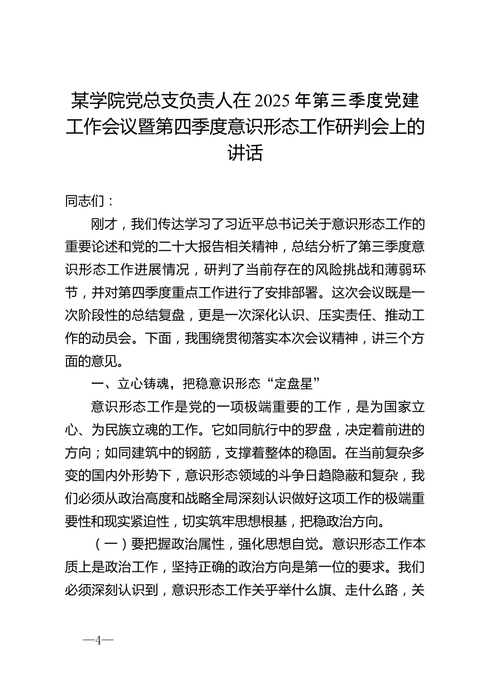 某學(xué)院黨總支負(fù)責(zé)人在2025年第三季度黨建工作會(huì)議暨第四季度意識(shí)形態(tài)工作研判會(huì)上的講話同志們:剛才,我們傳達(dá)學(xué)習(xí)了習(xí)近平總書記關(guān)于意識(shí)形態(tài)工作的重要論述和黨的二十大報(bào)告相關(guān)精神,總結(jié)分析了第三季度意識(shí)形態(tài)工作進(jìn)展情況,研判了當(dāng)前存在的風(fēng)險(xiǎn)挑戰(zhàn)和薄弱環(huán)節(jié),并對(duì)第四季度重點(diǎn)工作進(jìn)行了安排部署。這次會(huì)議既是一次階段性的總結(jié)復(fù)盤,更是一次深化認(rèn)識(shí)、壓實(shí)責(zé)任、推動(dòng)工作的動(dòng)員會(huì)。下面,我圍繞貫徹落實(shí)本次會(huì)議精神,講三個(gè)方面的意見(jiàn)。一、立心鑄魂,把穩(wěn)意識(shí)形態(tài)“定盤星”意識(shí)形態(tài)工作是黨的一項(xiàng)極端重要的工作,是為國(guó)家立心、為民族立魂的工作。它如同...