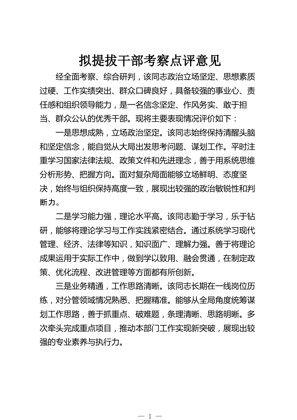 擬提拔干部考察點(diǎn)評(píng)意見經(jīng)全面考察、綜合研判,該同志政治立場堅(jiān)定、思想素質(zhì)過硬、工作實(shí)績突出、群眾口碑良好,具備較強(qiáng)的事業(yè)心、責(zé)任感和組織領(lǐng)導(dǎo)能力,是一名信念堅(jiān)定、作風(fēng)務(wù)實(shí)、敢于擔(dān)當(dāng)、群眾公認(rèn)的優(yōu)秀干部。現(xiàn)將主要表現(xiàn)情況評(píng)價(jià)如下:一是思想成熟,立場政治堅(jiān)定。該同志始終保持清醒頭腦和堅(jiān)定信念,能自覺從大局出發(fā)思考問題、謀劃工作。平時(shí)注重學(xué)習(xí)國家法律法規(guī)、政策文件和先進(jìn)理念,善于用系統(tǒng)思維分析形勢、把握方向。面對(duì)復(fù)雜局面能夠立場鮮明、態(tài)度堅(jiān)決,始終與組織保持高度一致,展現(xiàn)出較強(qiáng)的政治敏銳性和判斷力。二是學(xué)習(xí)能力強(qiáng),理論水平高。該同...