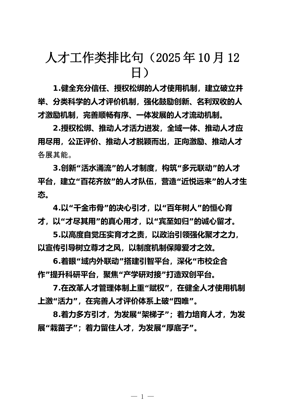 人才工作類排比句(2025年10月12日)1.健全充分信任、授權(quán)松綁的人才使用機(jī)制,建立破立并舉、分類科學(xué)的人才評價(jià)機(jī)制,強(qiáng)化鼓勵創(chuàng)新、名利雙收的人才激勵機(jī)制,完善順暢有序、一體發(fā)展的人才流動機(jī)制。2.授權(quán)松綁、推動人才活力迸發(fā),全域一體、推動人才應(yīng)用盡用,公正評價(jià)、推動人才脫穎而出,正向激勵、推動人才各展其能。3.“”“”創(chuàng)新活水涌流的人才制度,構(gòu)筑多元聯(lián)動的人才“”“”平臺,建立百花齊放的人才隊(duì)伍,營造近悅遠(yuǎn)來的人才生態(tài)。4.“”“”以千金市骨的決心引才,以百年樹人的恒心育“”“”才,以才盡其用的真心用才,以賓至如歸的誠心留才。5.以高度...