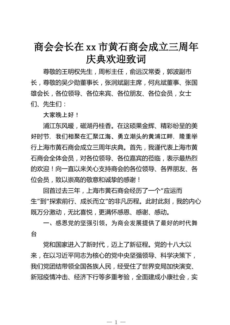 商會(huì)會(huì)長在xx市黃石商會(huì)成立三周年慶典歡迎致詞