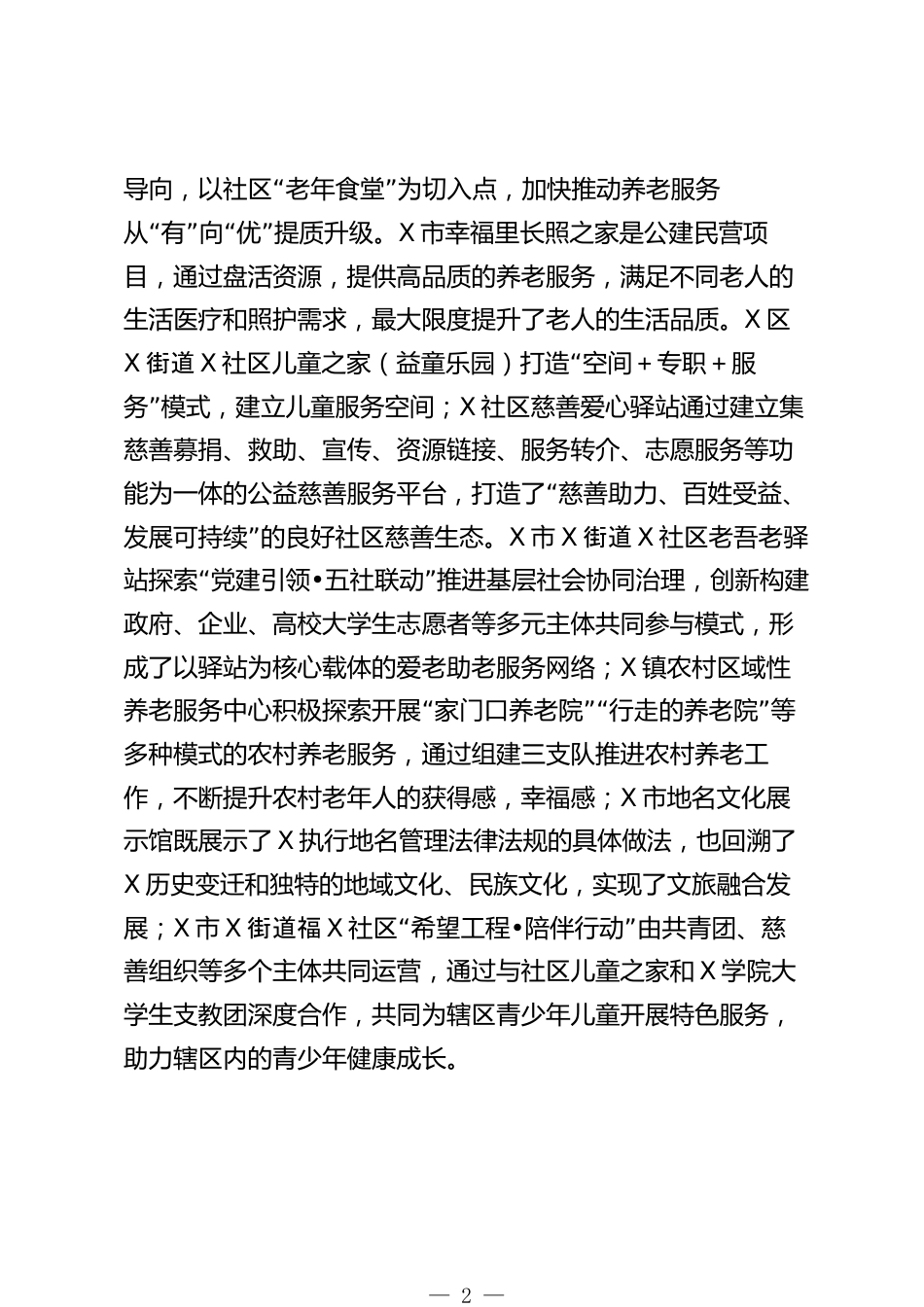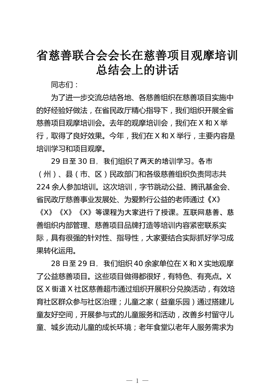 省慈善聯(lián)合會會長在慈善項目觀摩培訓總結(jié)會上的講話同志們:為了進一步交流總結(jié)各地、各慈善組織在慈善項目實施中的好經(jīng)驗好做法,在省民政廳精心指導下,我們組織開展全省慈善項目觀摩培訓會。去年的觀摩培訓會,我們在X和X舉行,取得了良好效果。今年,我們在X和X舉行,主要內(nèi)容是培訓學習和項目觀摩。29日至30日,我了兩天的培學。各市們組織訓習(州)、縣(市、區(qū))民政部門和各級慈善組織負責同志共224余人參加培訓。這次培訓,字節(jié)跳動公益、騰訊基金會、省民政廳慈善事業(yè)發(fā)展處、為愛黔行公益的老師通過《X》《X》《X》《X》等程大家行了授。互網(wǎng)慈善、慈課為進...