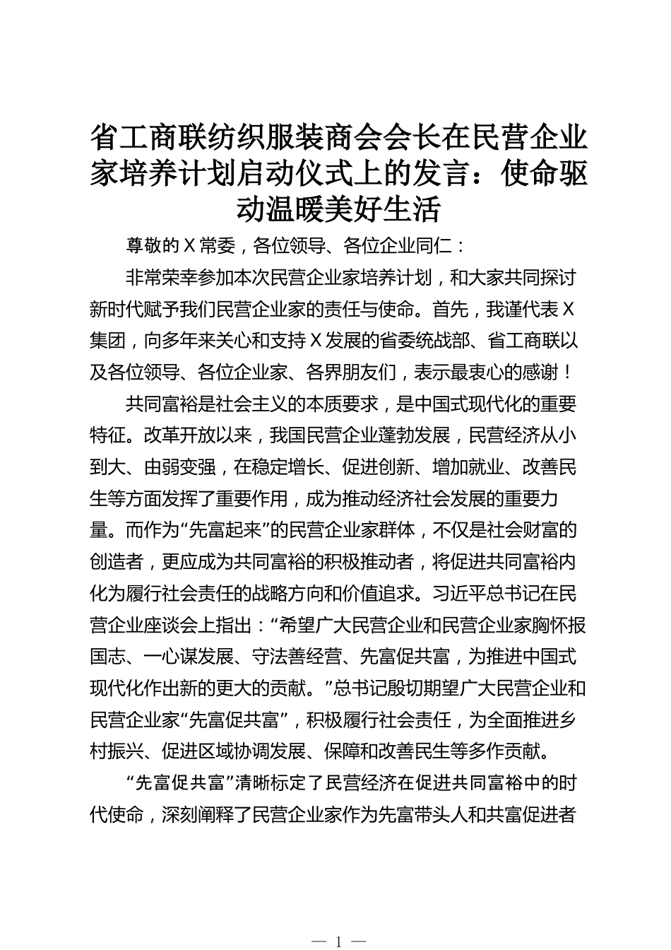 省工商聯(lián)紡織服裝商會會長在民營企業(yè)家培養(yǎng)計劃啟動儀式上的發(fā)言:使命驅(qū)動溫暖美好生活