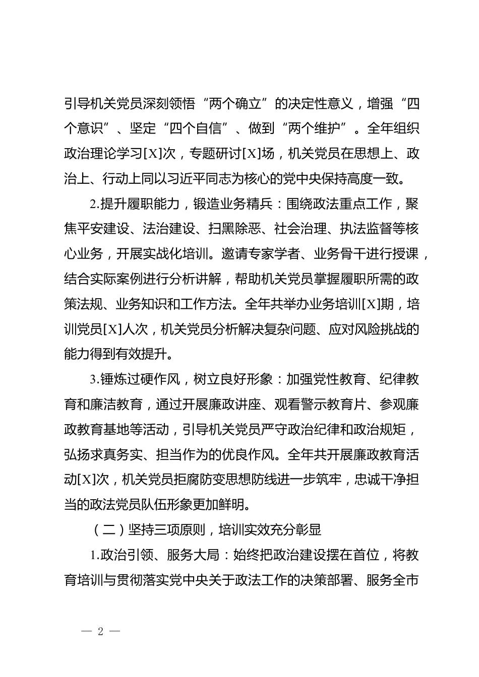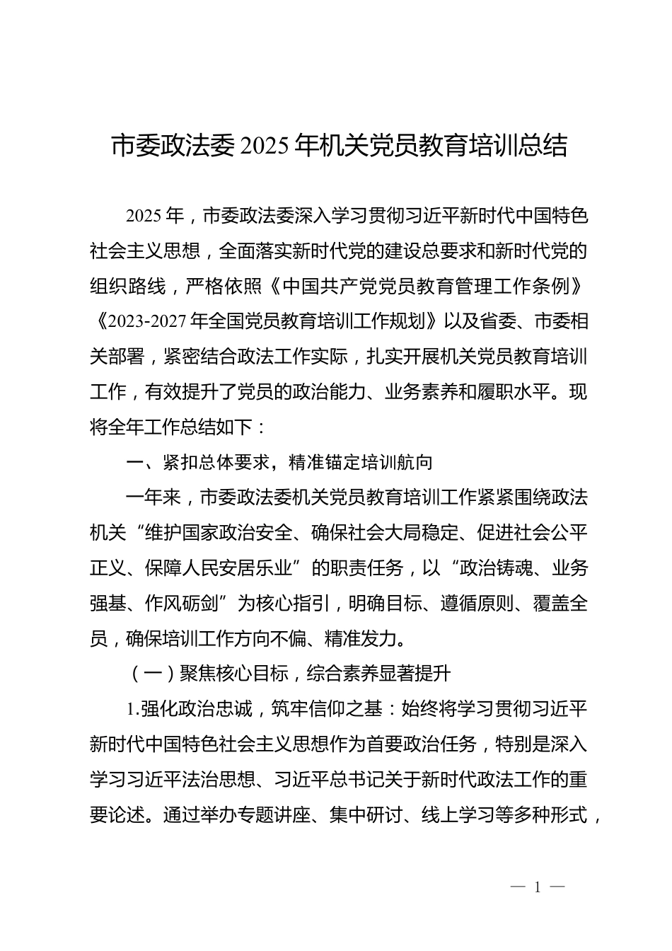 市委政法委2025年機關(guān)黨員教育培訓總結(jié)2025年,市委政法委深入學習貫徹習近平新時代中國特色社會主義思想,全面落實新時代黨的建設總要求和新時代黨的組織路線,嚴格依照《中國共產(chǎn)黨黨員教育管理工作條例》《2023-2027年全國黨員教育培訓工作規(guī)劃》以及省委、市委相關(guān)部署,緊密結(jié)合政法工作實際,扎實開展機關(guān)黨員教育培訓工作,有效提升了黨員的政治能力、業(yè)務素養(yǎng)和履職水平?,F(xiàn)將全年工作總結(jié)如下:一、緊扣總體要求,精準錨定培訓航向一年來,市委政法委機關(guān)黨員教育培訓工作緊緊圍繞政法機關(guān)“維護國家政治安全、確保社會大局穩(wěn)定、促進社會公平正義、保障人民安...