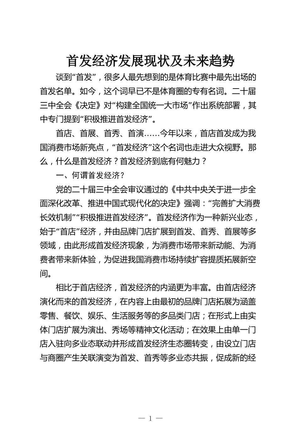 首發(fā)經(jīng)濟(jì)發(fā)展現(xiàn)狀及未來(lái)趨勢(shì)“”談到首發(fā),很多人最先想到的是體育比賽中最先出場(chǎng)的首發(fā)名單。如今,這個(gè)詞早已不是體育圈的專有名詞。二十屆“”三中全會(huì)《決定》對(duì)構(gòu)建全國(guó)統(tǒng)一大市場(chǎng)作出系統(tǒng)部署,其“”中專門提到積極推進(jìn)首發(fā)經(jīng)濟(jì)。首店、首展、首秀、首演……今年以來(lái),首店首發(fā)成為我“”國(guó)消費(fèi)市場(chǎng)新亮點(diǎn),首發(fā)經(jīng)濟(jì)這個(gè)名詞也走進(jìn)大眾視野。那么,什么是首發(fā)經(jīng)濟(jì)?首發(fā)經(jīng)濟(jì)到底有何魅力?一、何謂首發(fā)經(jīng)濟(jì)?黨的二十屆三中全會(huì)審議通過(guò)的《中共中央關(guān)于進(jìn)一步全“面深化改革、推進(jìn)中國(guó)式現(xiàn)代化的決定》強(qiáng)調(diào):完善擴(kuò)大消費(fèi)”“”長(zhǎng)效機(jī)制積極推進(jìn)首發(fā)經(jīng)濟(jì)。首發(fā)經(jīng)...