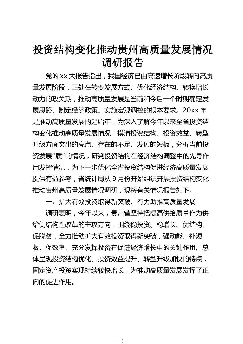 投資結(jié)構(gòu)變化推動貴州高質(zhì)量發(fā)展情況調(diào)研報告黨的xx大報告指出,我國經(jīng)濟(jì)已由高速增長階段轉(zhuǎn)向高質(zhì)量發(fā)展階段,正處在轉(zhuǎn)變發(fā)展方式、優(yōu)化經(jīng)濟(jì)結(jié)構(gòu)、轉(zhuǎn)換增長動力的攻關(guān)期,推動高質(zhì)量發(fā)展是當(dāng)前和今后一個時期確定發(fā)展思路、制定經(jīng)濟(jì)政策、實(shí)施宏觀調(diào)控的根本要求。20xx年是推動高質(zhì)量發(fā)展的起始年,為深入了解今年以來全省投資結(jié)構(gòu)變化推動高質(zhì)量發(fā)展情況,摸清投資結(jié)構(gòu)、投資效益、轉(zhuǎn)型升級方面突出的亮點(diǎn)、存在的不足、發(fā)展的短板,分析當(dāng)前投“”資發(fā)展質(zhì)的情況,研判投資結(jié)構(gòu)在經(jīng)濟(jì)結(jié)構(gòu)調(diào)整中的先導(dǎo)作用發(fā)揮情況,為下一步優(yōu)化全省投資結(jié)構(gòu)促進(jìn)經(jīng)濟(jì)高質(zhì)量發(fā)展提供有...