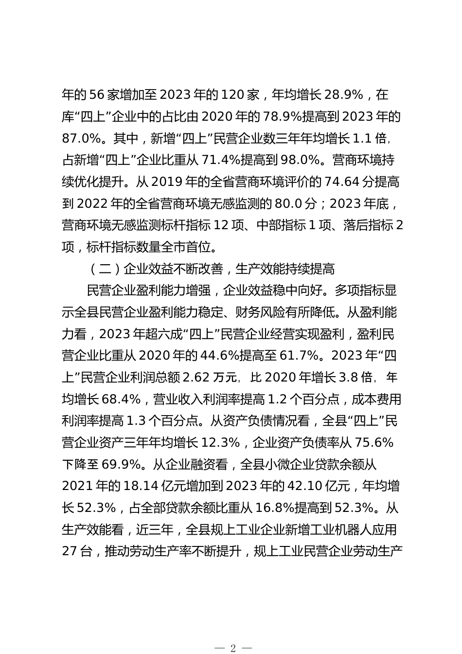 推動(dòng)青平民營經(jīng)濟(jì)高質(zhì)量發(fā)展的調(diào)研報(bào)告民營經(jīng)濟(jì)是社會(huì)主義市場經(jīng)濟(jì)的重要組成部分,在推動(dòng)發(fā)展、改善民生、促進(jìn)創(chuàng)新等方面發(fā)揮著不可替代的重要作用?!半S著民營經(jīng)濟(jì)中央31”“條、云西省32”條等一系列、穩(wěn)經(jīng)濟(jì)促投資、降稅費(fèi)的政策措施陸續(xù)出臺,給民營經(jīng)濟(jì)發(fā)展注入強(qiáng)大動(dòng)力,也標(biāo)志著民營經(jīng)濟(jì)迎來新的發(fā)展機(jī)遇。本文結(jié)合前期我局開展的民營企業(yè)發(fā)展情況調(diào)查、實(shí)地走訪調(diào)研以及青平縣民營經(jīng)濟(jì)監(jiān)測,以2020—2023年青平縣民營經(jīng)濟(jì)發(fā)展數(shù)據(jù)為基礎(chǔ),從五個(gè)維度分析民營經(jīng)濟(jì)發(fā)展現(xiàn)狀,剖析民營經(jīng)濟(jì)高質(zhì)量發(fā)展面臨的挑戰(zhàn),并提出建議對策推動(dòng)民營經(jīng)濟(jì)持續(xù)健康發(fā)展。一、發(fā)展...