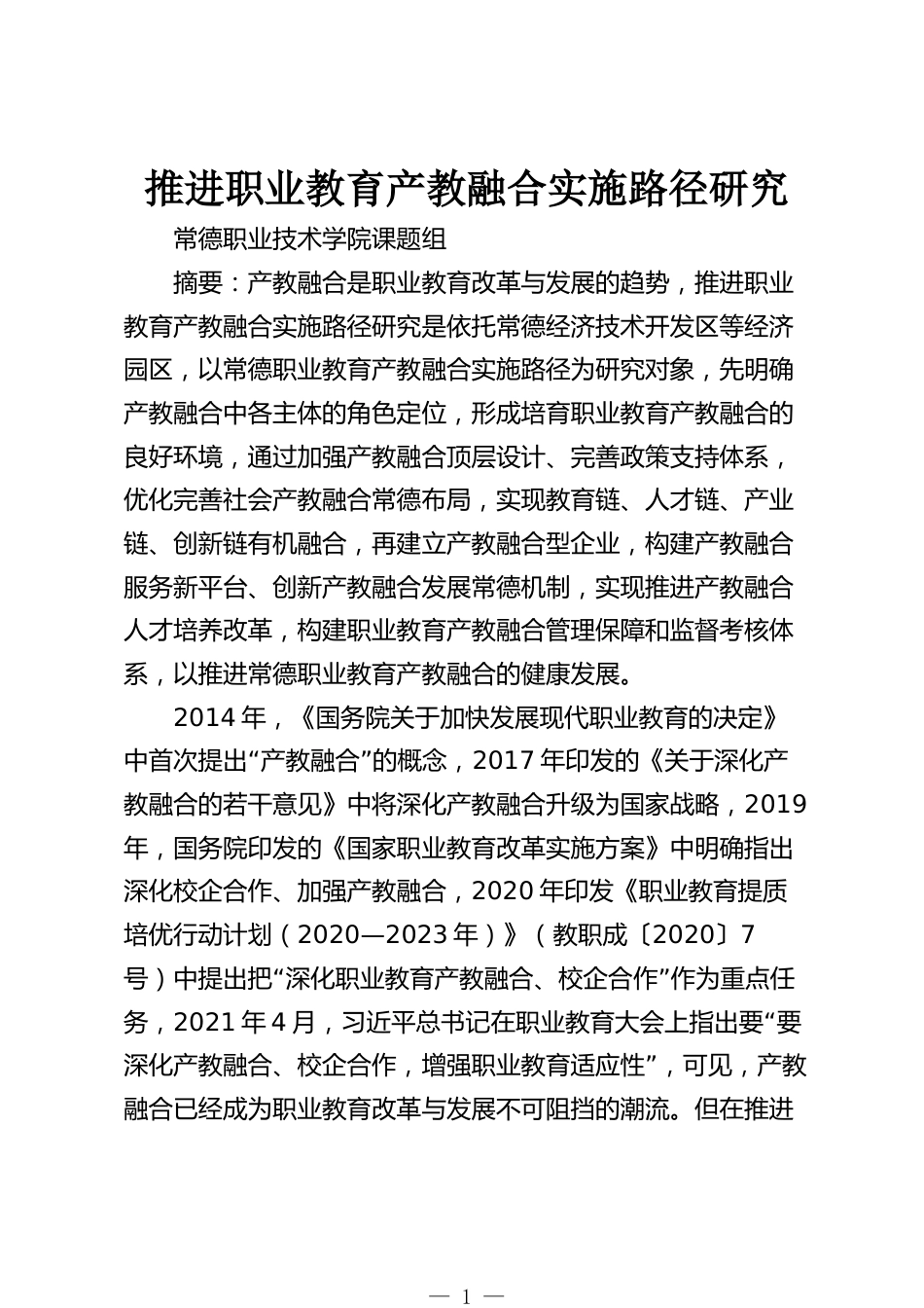 推進(jìn)職業(yè)教育產(chǎn)教融合實(shí)施路徑研究常德職業(yè)技術(shù)學(xué)院課題組摘要:產(chǎn)教融合是職業(yè)教育改革與發(fā)展的趨勢(shì),推進(jìn)職業(yè)教育產(chǎn)教融合實(shí)施路徑研究是依托常德經(jīng)濟(jì)技術(shù)開(kāi)發(fā)區(qū)等經(jīng)濟(jì)園區(qū),以常德職業(yè)教育產(chǎn)教融合實(shí)施路徑為研究對(duì)象,先明確產(chǎn)教融合中各主體的角色定位,形成培育職業(yè)教育產(chǎn)教融合的良好環(huán)境,通過(guò)加強(qiáng)產(chǎn)教融合頂層設(shè)計(jì)、完善政策支持體系,優(yōu)化完善社會(huì)產(chǎn)教融合常德布局,實(shí)現(xiàn)教育鏈、人才鏈、產(chǎn)業(yè)鏈、創(chuàng)新鏈有機(jī)融合,再建立產(chǎn)教融合型企業(yè),構(gòu)建產(chǎn)教融合服務(wù)新平臺(tái)、創(chuàng)新產(chǎn)教融合發(fā)展常德機(jī)制,實(shí)現(xiàn)推進(jìn)產(chǎn)教融合人才培養(yǎng)改革,構(gòu)建職業(yè)教育產(chǎn)教融合管理保障和監(jiān)督...