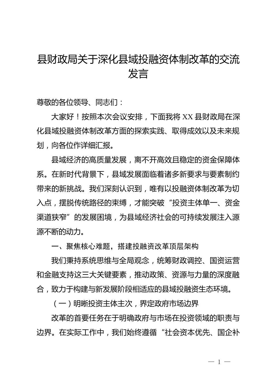 縣財政局關(guān)于深化縣域投融資體制改革的交流發(fā)言