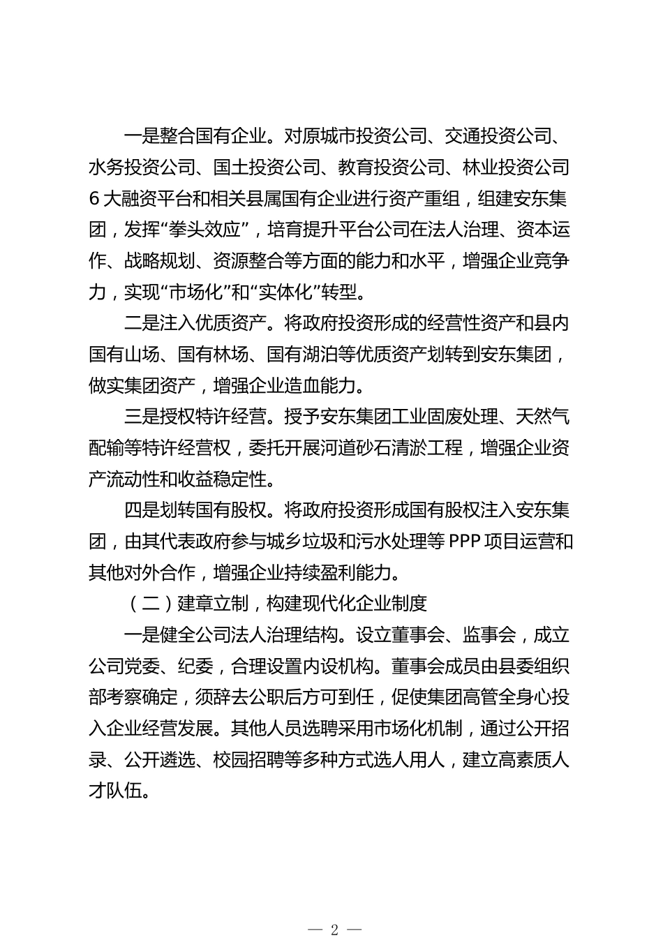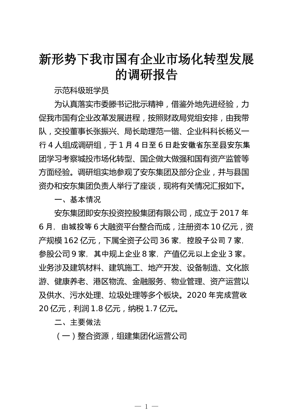 新形勢下我市國有企業(yè)市場化轉(zhuǎn)型發(fā)展的調(diào)研報告示范科級班學(xué)員為認(rèn)真落實(shí)市委滕書記批示精神,借鑒外地先進(jìn)經(jīng)驗(yàn),力促我市國有企業(yè)改革發(fā)展進(jìn)程,按照財政局黨組安排,由我?guī)ш?duì),交投董事長張振興、局長助理范一鍇、企業(yè)科科長楊義一行4人組成調(diào)研組,于1月4日至6日赴安徽省至安集東縣東團(tuán)學(xué)習(xí)考察城投市場化轉(zhuǎn)型、國企做大做強(qiáng)和國有資產(chǎn)監(jiān)管等方面經(jīng)驗(yàn)。調(diào)研組實(shí)地參觀了安東集團(tuán)及部分企業(yè),并與縣國資辦和安東集團(tuán)負(fù)責(zé)人舉行了座談,現(xiàn)將有關(guān)情況匯報如下。一、基本情況安東集團(tuán)即安東投資控股集團(tuán)有限公司,成立于2017年6月,由城投等6大融資平臺整合而成,注冊資本...