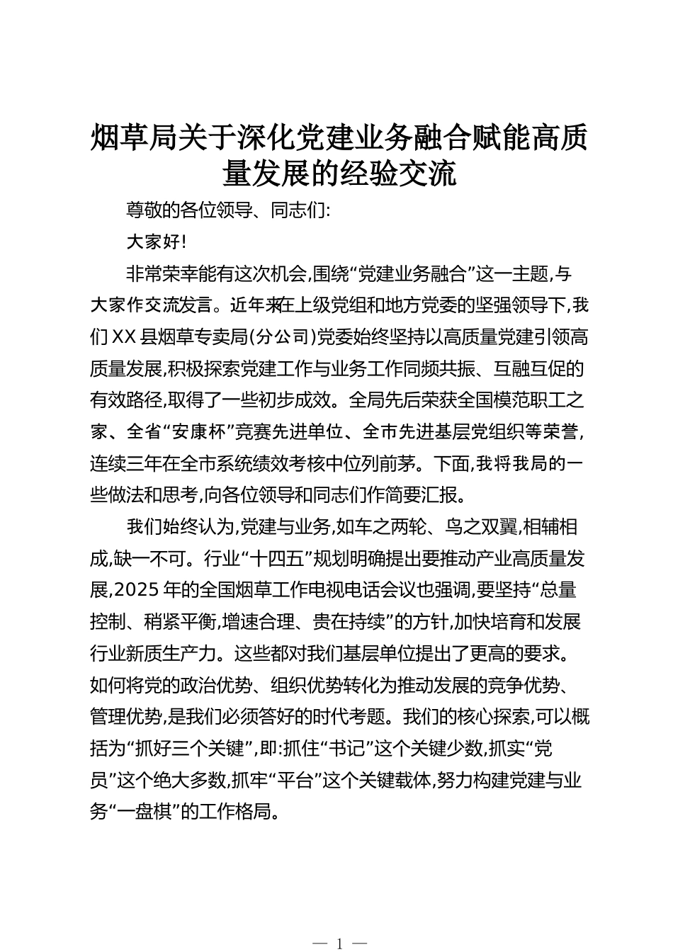 煙草局關(guān)于深化黨建業(yè)務(wù)融合賦能高質(zhì)量發(fā)展的經(jīng)驗(yàn)交流尊敬的各位領(lǐng)導(dǎo)、同志們:大家好!非常榮幸能有這次機(jī)會,“”圍繞黨建業(yè)務(wù)融合這一主題,與大家作交流發(fā)言。近年來,在上級黨組和地方黨委的堅(jiān)強(qiáng)領(lǐng)導(dǎo)下,我們XX縣煙草專賣局(分公司)黨委始終堅(jiān)持以高質(zhì)量黨建引領(lǐng)高質(zhì)量發(fā)展,積極探索黨建工作與業(yè)務(wù)工作同頻共振、互融互促的有效路徑,取得了一些初步成效。全局先后榮獲全國模范職工之“家、全省安康杯”先位、全市先基黨等榮譽(yù)競賽進(jìn)單進(jìn)層組織,連續(xù)三年在全市系統(tǒng)績效考核中位列前茅。下面,我將我局的一些做法和思考,向各位領(lǐng)導(dǎo)和同志們作簡要匯報(bào)。我們始終認(rèn)為,黨建與業(yè)...