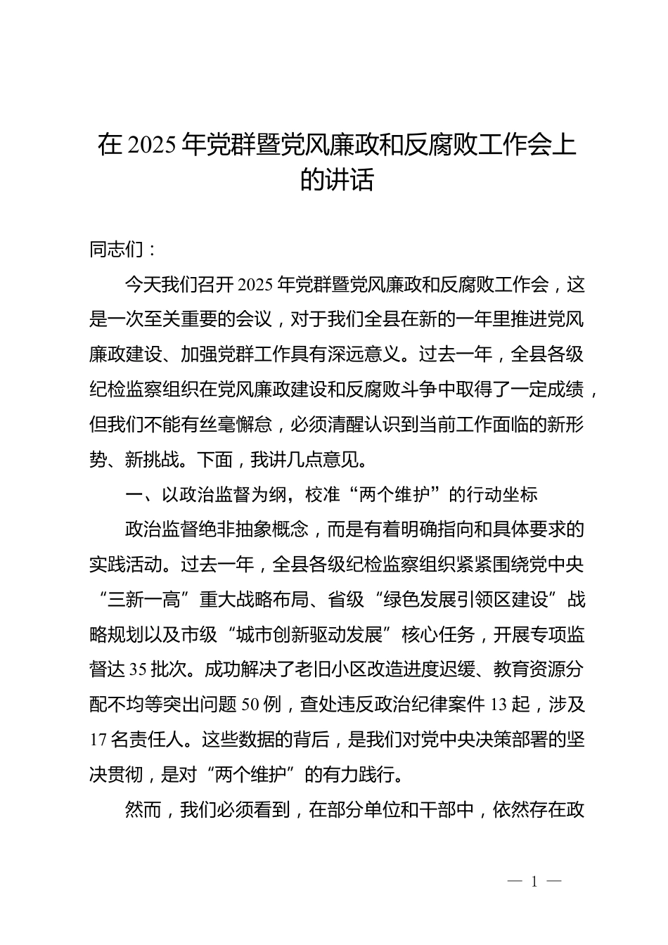 在2025年黨群暨黨風(fēng)廉政和反腐敗工作會上的講話同志們:今天我們召開2025年黨群暨黨風(fēng)廉政和反腐敗工作會,這是一次至關(guān)重要的會議,對于我們?nèi)h在新的一年里推進黨風(fēng)廉政建設(shè)、加強黨群工作具有深遠意義。過去一年,全縣各級紀(jì)檢監(jiān)察組織在黨風(fēng)廉政建設(shè)和反腐敗斗爭中取得了一定成績,但我們不能有絲毫懈怠,必須清醒認識到當(dāng)前工作面臨的新形勢、新挑戰(zhàn)。下面,我講幾點意見。一、以政治監(jiān)督為綱,校準(zhǔn)“兩個維護”的行動坐標(biāo)政治監(jiān)督絕非抽象概念,而是有著明確指向和具體要求的實踐活動。過去一年,全縣各級紀(jì)檢監(jiān)察組織緊緊圍繞黨中央“三新一高”重大戰(zhàn)略布局、省...