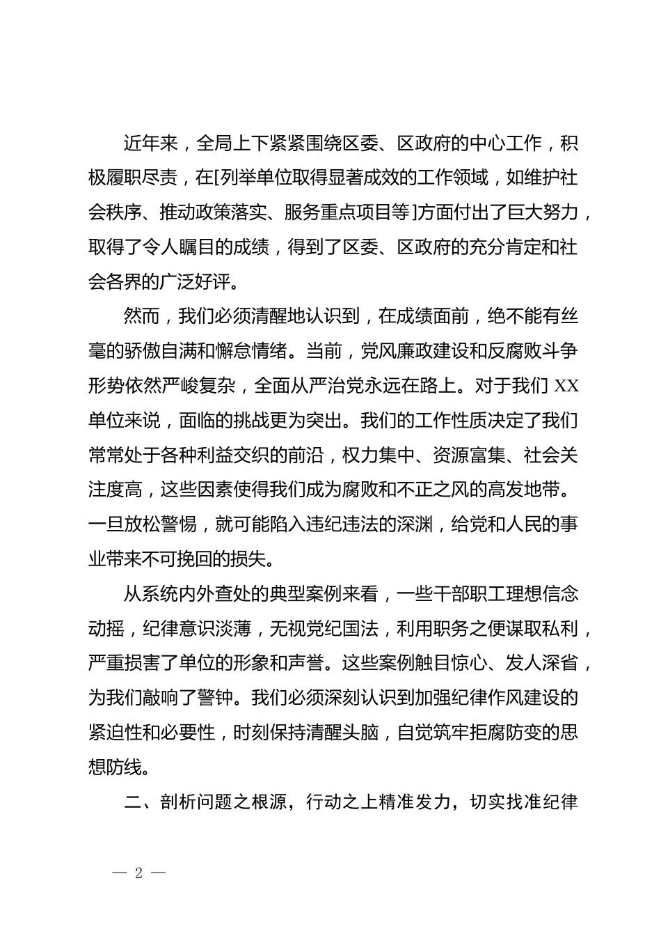 在XX單位紀(jì)律作風(fēng)警示教育會上的講話同志們:今天,我們專門召開全局紀(jì)律作風(fēng)警示教育大會。這次會議意義重大且深遠(yuǎn),核心在于深入貫徹落實(shí)關(guān)于強(qiáng)化自我約束、推動全面從嚴(yán)管理的重要指示精神。我們將通過深入剖析系統(tǒng)內(nèi)外具有代表性的典型案例,以這些案例為鏡子、為規(guī)矩、為鞭策,引導(dǎo)全體干部職工進(jìn)一步嚴(yán)守紀(jì)律紅線、錘煉優(yōu)良作風(fēng),為我區(qū)[單位職能相關(guān)的事業(yè)名稱]的高質(zhì)量發(fā)展提供堅實(shí)的紀(jì)律保障。剛才,XX同志通報了相關(guān)典型案例,XX同志也對廉潔自律提出了明確要求,我完全贊同,希望大家認(rèn)真領(lǐng)會、嚴(yán)格落實(shí)。下面,我講三點(diǎn)意見。一、認(rèn)清形勢之嚴(yán)峻,思想深處敲...