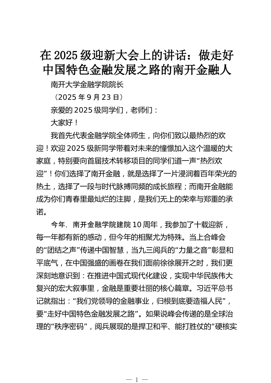 在2025級迎新大會上的講話:做走好中國特色金融發(fā)展之路的南開金融人