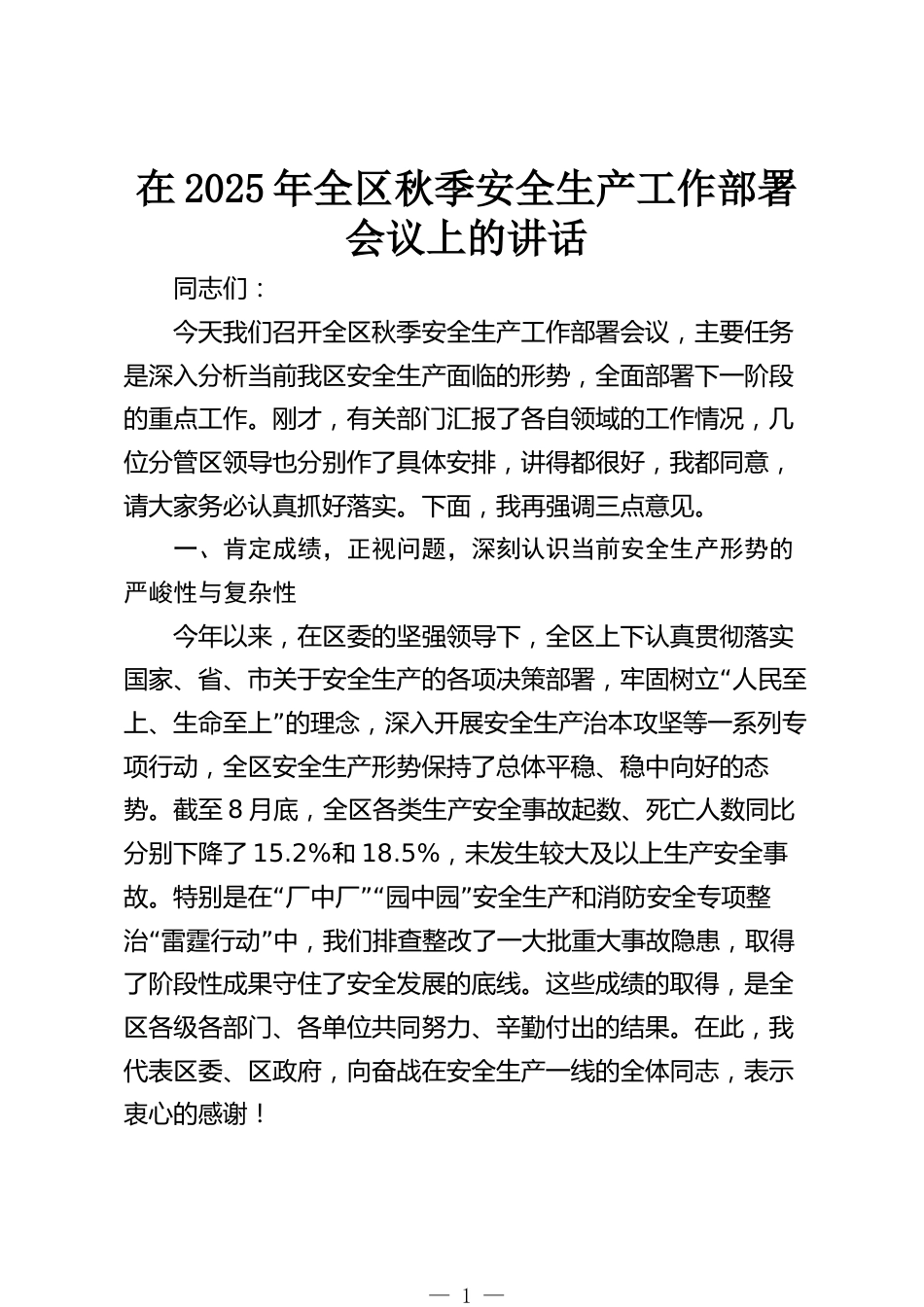 在2025年全區(qū)秋季安全生產(chǎn)工作部署會(huì)議上的講話同志們:今天我們召開(kāi)全區(qū)秋季安全生產(chǎn)工作部署會(huì)議,主要任務(wù)是深入分析當(dāng)前我區(qū)安全生產(chǎn)面臨的形勢(shì),全面部署下一階段的重點(diǎn)工作。剛才,有關(guān)部門(mén)匯報(bào)了各自領(lǐng)域的工作情況,幾位分管區(qū)領(lǐng)導(dǎo)也分別作了具體安排,講得都很好,我都同意,請(qǐng)大家務(wù)必認(rèn)真抓好落實(shí)。下面,我再?gòu)?qiáng)調(diào)三點(diǎn)意見(jiàn)。一、肯定成績(jī),正視問(wèn)題,深刻認(rèn)識(shí)當(dāng)前安全生產(chǎn)形勢(shì)的嚴(yán)峻性與復(fù)雜性今年以來(lái),在區(qū)委的堅(jiān)強(qiáng)領(lǐng)導(dǎo)下,全區(qū)上下認(rèn)真貫徹落實(shí)“國(guó)家、省、市關(guān)于安全生產(chǎn)的各項(xiàng)決策部署,牢固樹(shù)立人民至”上、生命至上的理念,深入開(kāi)展安全生產(chǎn)治本攻堅(jiān)等...