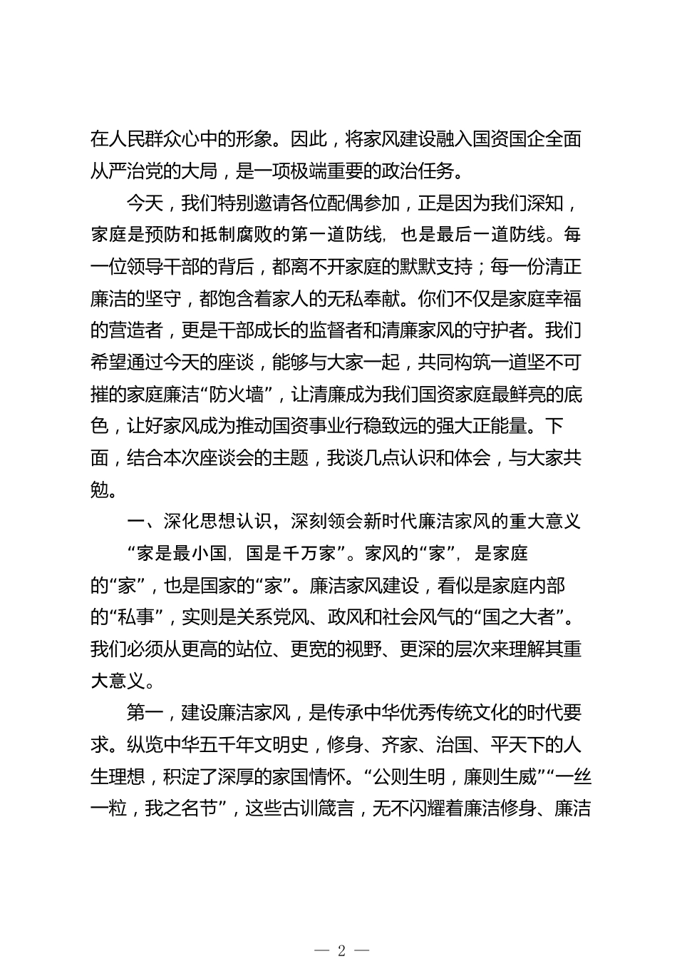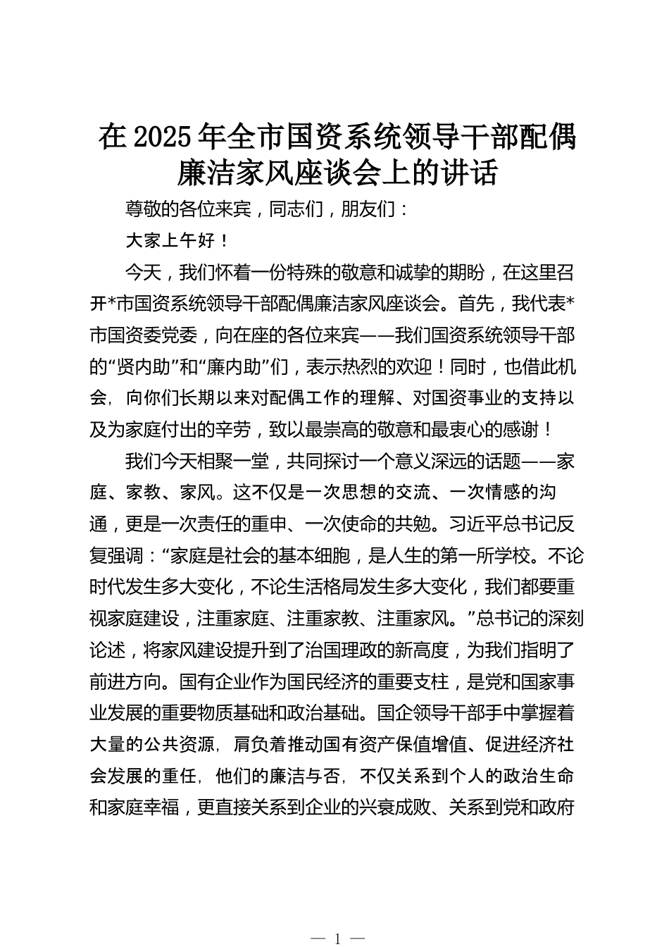 在2025年全市國資系統(tǒng)領(lǐng)導(dǎo)干部配偶廉潔家風(fēng)座談會上的講話