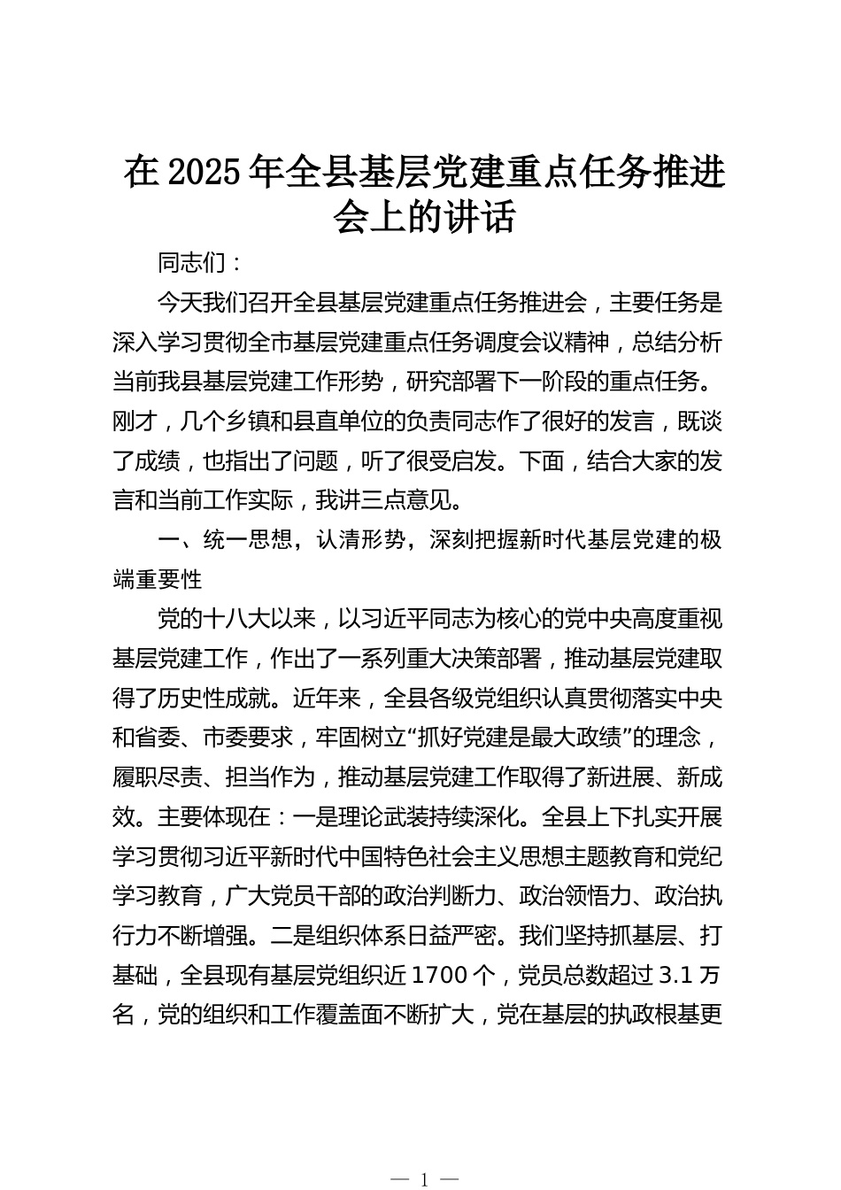 在2025年全縣基層黨建重點(diǎn)任務(wù)推進(jìn)會(huì)上的講話同志們:今天我們召開全縣基層黨建重點(diǎn)任務(wù)推進(jìn)會(huì),主要任務(wù)是深入學(xué)習(xí)貫徹全市基層黨建重點(diǎn)任務(wù)調(diào)度會(huì)議精神,總結(jié)分析當(dāng)前我縣基層黨建工作形勢(shì),研究部署下一階段的重點(diǎn)任務(wù)。剛才,幾個(gè)鄉(xiāng)鎮(zhèn)和縣直單位的負(fù)責(zé)同志作了很好的發(fā)言,既談了成績(jī),也指出了問題,聽了很受啟發(fā)。下面,結(jié)合大家的發(fā)言和當(dāng)前工作實(shí)際,我講三點(diǎn)意見。一、統(tǒng)一思想,認(rèn)清形勢(shì),深刻把握新時(shí)代基層黨建的極端重要性黨的十八大以來,以習(xí)近平同志為核心的黨中央高度重視基層黨建工作,作出了一系列重大決策部署,推動(dòng)基層黨建取得了歷史性成就。近年...