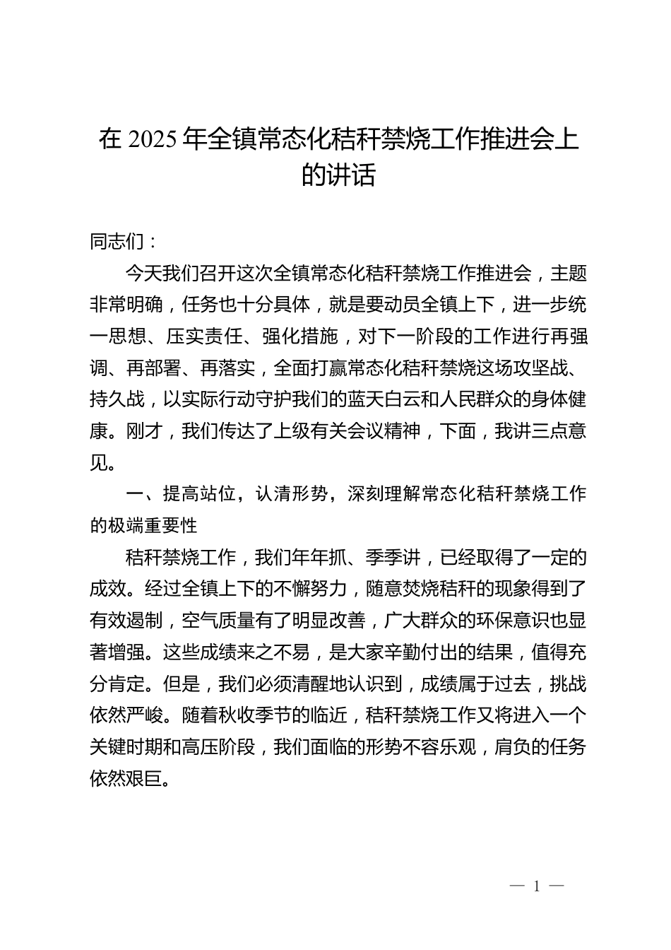 在2025年全鎮(zhèn)常態(tài)化秸稈禁燒工作推進(jìn)會(huì)上的講話同志們:今天我們召開這次全鎮(zhèn)常態(tài)化秸稈禁燒工作推進(jìn)會(huì),主題非常明確,任務(wù)也十分具體,就是要?jiǎng)訂T全鎮(zhèn)上下,進(jìn)一步統(tǒng)一思想、壓實(shí)責(zé)任、強(qiáng)化措施,對(duì)下一階段的工作進(jìn)行再?gòu)?qiáng)調(diào)、再部署、再落實(shí),全面打贏常態(tài)化秸稈禁燒這場(chǎng)攻堅(jiān)戰(zhàn)、持久戰(zhàn),以實(shí)際行動(dòng)守護(hù)我們的藍(lán)天白云和人民群眾的身體健康。剛才,我們傳達(dá)了上級(jí)有關(guān)會(huì)議精神,下面,我講三點(diǎn)意見。一、提高站位,認(rèn)清形勢(shì),深刻理解常態(tài)化秸稈禁燒工作的極端重要性秸稈禁燒工作,我們年年抓、季季講,已經(jīng)取得了一定的成效。經(jīng)過全鎮(zhèn)上下的不懈努力,隨意焚燒秸稈的...