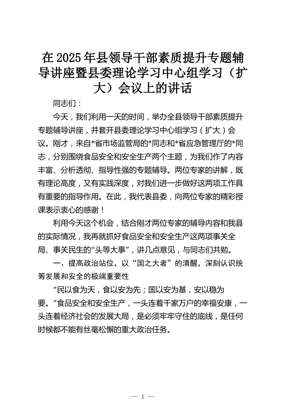 在2025年縣領(lǐng)導(dǎo)干部素質(zhì)提升專題輔導(dǎo)講座暨縣委理論學(xué)習(xí)中心組學(xué)習(xí)(擴大)會議上的講話同志們:今天,我們利用一天的時間,舉辦全縣領(lǐng)導(dǎo)干部素質(zhì)提升專題輔導(dǎo)講座,并套開縣委理論學(xué)習(xí)中心組學(xué)習(xí)(擴大)會議。剛才,來自*省市場監(jiān)管局的*同志和*省應(yīng)急管理廳的*同志,分別圍繞食品安全和安全生產(chǎn)兩個主題,為我們作了內(nèi)容豐富、分析透徹、指導(dǎo)性強的專題輔導(dǎo)。兩位專家的講解,既有理論高度,又有實踐深度,對我們進(jìn)一步做好這兩項工作具有重要的指導(dǎo)作用。在此,我代表縣委,向兩位專家的精彩授課表示衷心的感謝!利用今天這個機會,結(jié)合剛才兩位專家的輔導(dǎo)內(nèi)容和我縣...