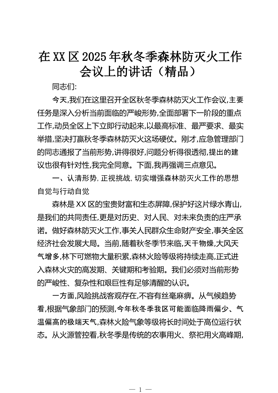 在XX區(qū)2025年秋冬季森林防滅火工作會(huì)議上的講話(精品)