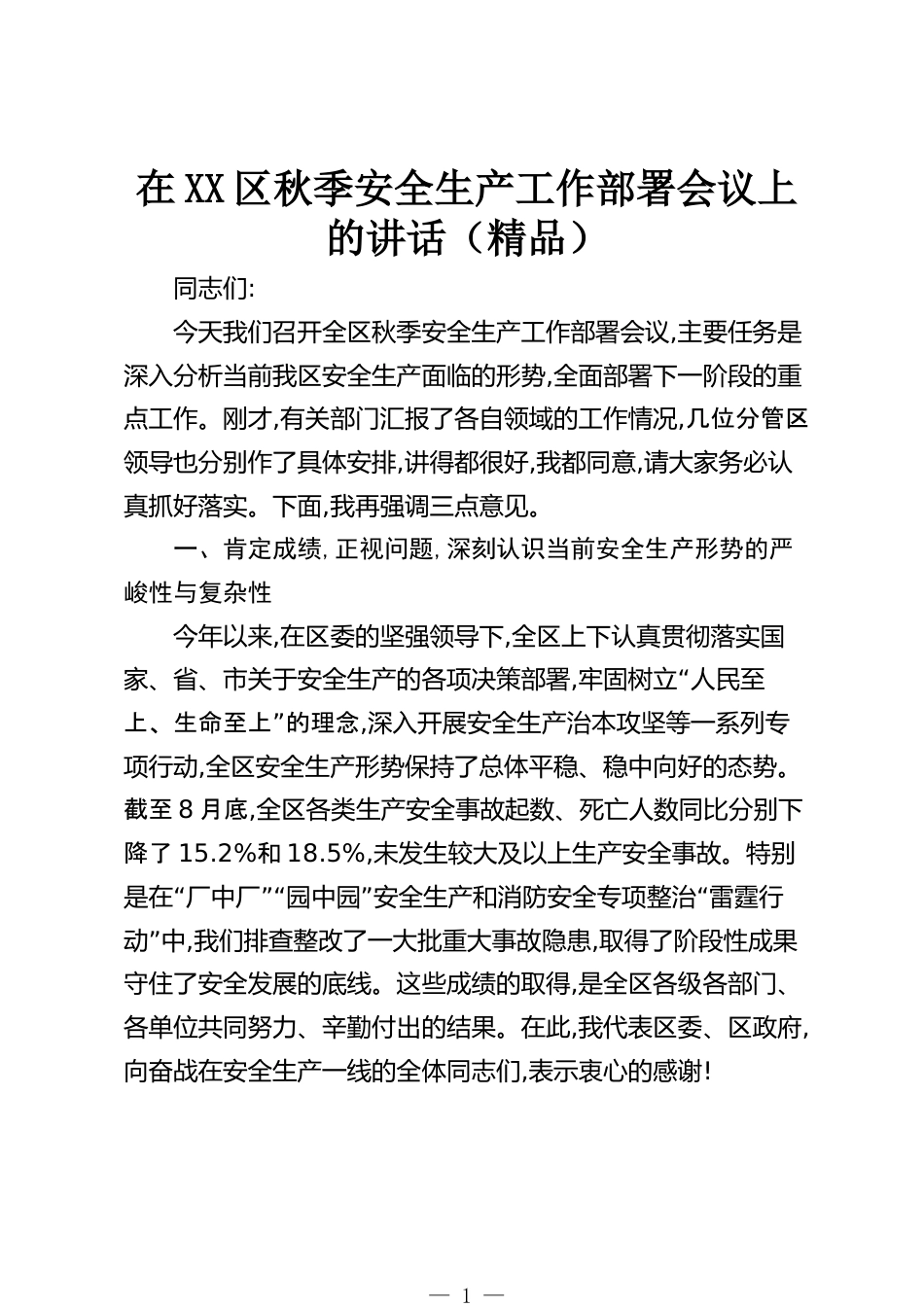在XX區(qū)秋季安全生產工作部署會議上的講話(精品)