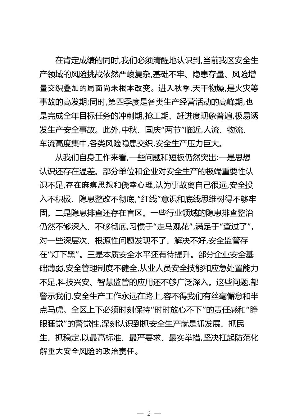 在XX區(qū)秋季安全生產工作部署會議上的講話(精品)同志們:今天我們召開全區(qū)秋季安全生產工作部署會議,主要任務是深入分析當前我區(qū)安全生產面臨的形勢,全面部署下一階段的重點工作。剛才,有關部門匯報了各自領域的工作情況,幾位分管區(qū)領導也分別作了具體安排,講得都很好,我都同意,請大家務必認真抓好落實。下面,我再強調三點意見。一、肯定成績,正視問題,深刻認識當前安全生產形勢的嚴峻性與復雜性今年以來,在區(qū)委的堅強領導下,全區(qū)上下認真貫徹落實國家、省、市關于安全生產的各項決策部署,“牢固樹立人民至”上、生命至上的理念,深入開展安全生產治本攻堅等一系列專項行...