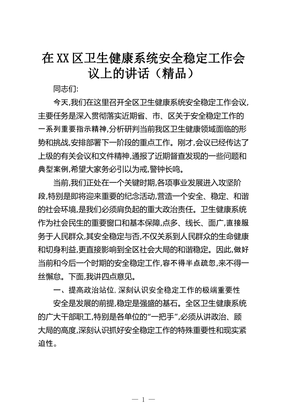 在XX區(qū)衛(wèi)生健康系統(tǒng)安全穩(wěn)定工作會議上的講話(精品)