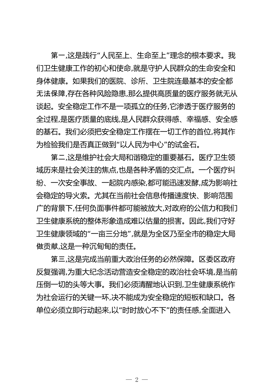 在XX區(qū)衛(wèi)生健康系統(tǒng)安全穩(wěn)定工作會議上的講話(精品)同志們:今天,我們在這里召開全區(qū)衛(wèi)生健康系統(tǒng)安全穩(wěn)定工作會議,主要任務(wù)是深入貫徹落實近期省、市、區(qū)關(guān)于安全穩(wěn)定工作的一系列重要指示精神,分析研判當(dāng)前我區(qū)衛(wèi)生健康領(lǐng)域面臨的形勢和挑戰(zhàn),安排部署下一階段的重點工作。剛才,會議已經(jīng)傳達(dá)了上級的有關(guān)會議和文件精神,通報了近期督查發(fā)現(xiàn)的一些問題和典型案例,希望大家務(wù)必引以為戒,警鐘長鳴。當(dāng)前,我們正處在一個關(guān)鍵時期,各項事業(yè)發(fā)展進(jìn)入攻堅階段,特別是即將迎來重要的紀(jì)念活動,營造一個安全、穩(wěn)定、和諧的社會環(huán)境,是我們必須肩負(fù)起的重大政治責(zé)任。衛(wèi)生健康系統(tǒng)...