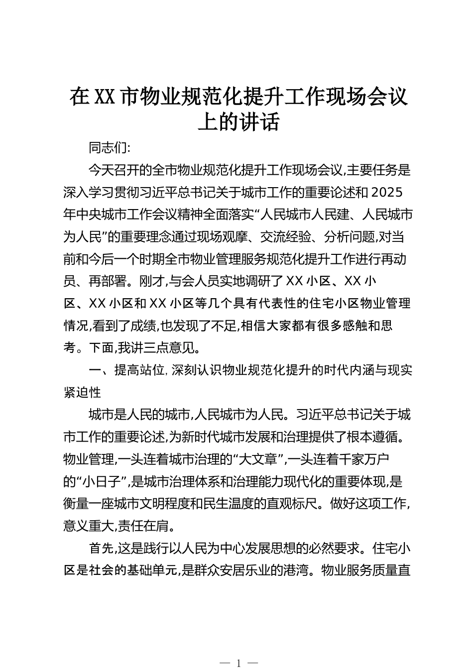 在XX市物業(yè)規(guī)范化提升工作現(xiàn)場會議上的講話