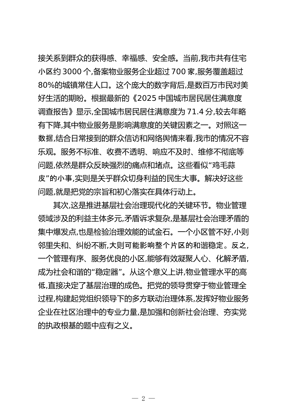 在XX市物業(yè)規(guī)范化提升工作現(xiàn)場會議上的講話同志們:今天召開的全市物業(yè)規(guī)范化提升工作現(xiàn)場會議,主要任務是深入學習貫徹習近平總書記關于城市工作的重要論述和2025“年中央城市工作會議精神全面落實人民城市人民建、人民城市”為人民的重要理念通過現(xiàn)場觀摩、交流經(jīng)驗、分析問題,對當前和今后一個時期全市物業(yè)管理服務規(guī)范化提升工作進行再動員、再部署。剛才,與會人員實地調(diào)研了XX小區(qū)、XX小區(qū)、XX小區(qū)和XX小區(qū)等幾個具有代表性的住宅小區(qū)物管理業(yè)情況,看到了成績,也發(fā)現(xiàn)了不足,相信大家都有很多感觸和思考。下面,我講三點意見。一、提高站位,深刻認識物業(yè)規(guī)范化提升的時...